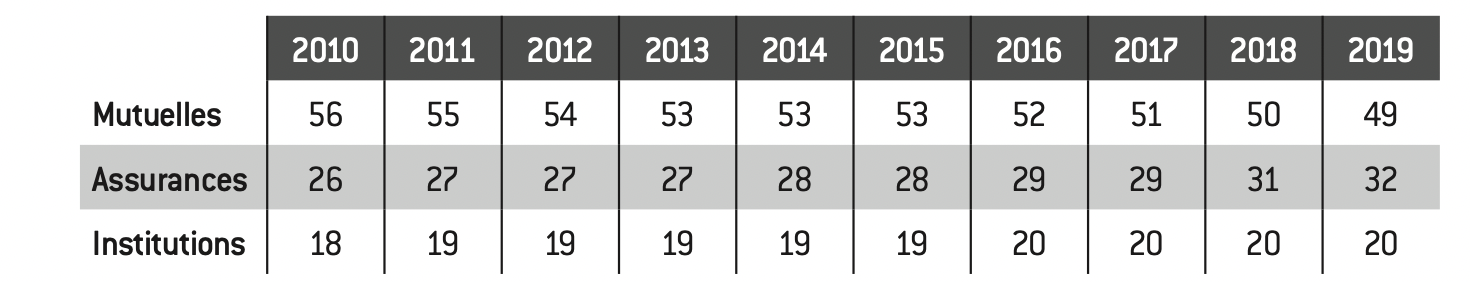 ACPR ; Raphaële Adjerad, « Rapport 2019 – La situation financière des organismes complémentaires assurant une couverture santé », Drees, août 2020.