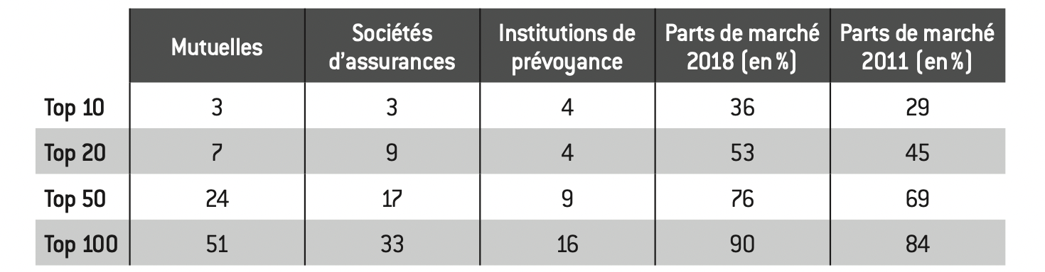 Malgré cela, le marché demeure plutôt déconcentré : les dix plus gros organismes ne représentent que 36% du marché (en part des cotisations collectées), tandis que les vingt plus gros organismes concentrent la moitié du marché (voir tableau 5). À titre de comparaison, aux Pays-Bas, seules quatre caisses couvrent 80% du marché.