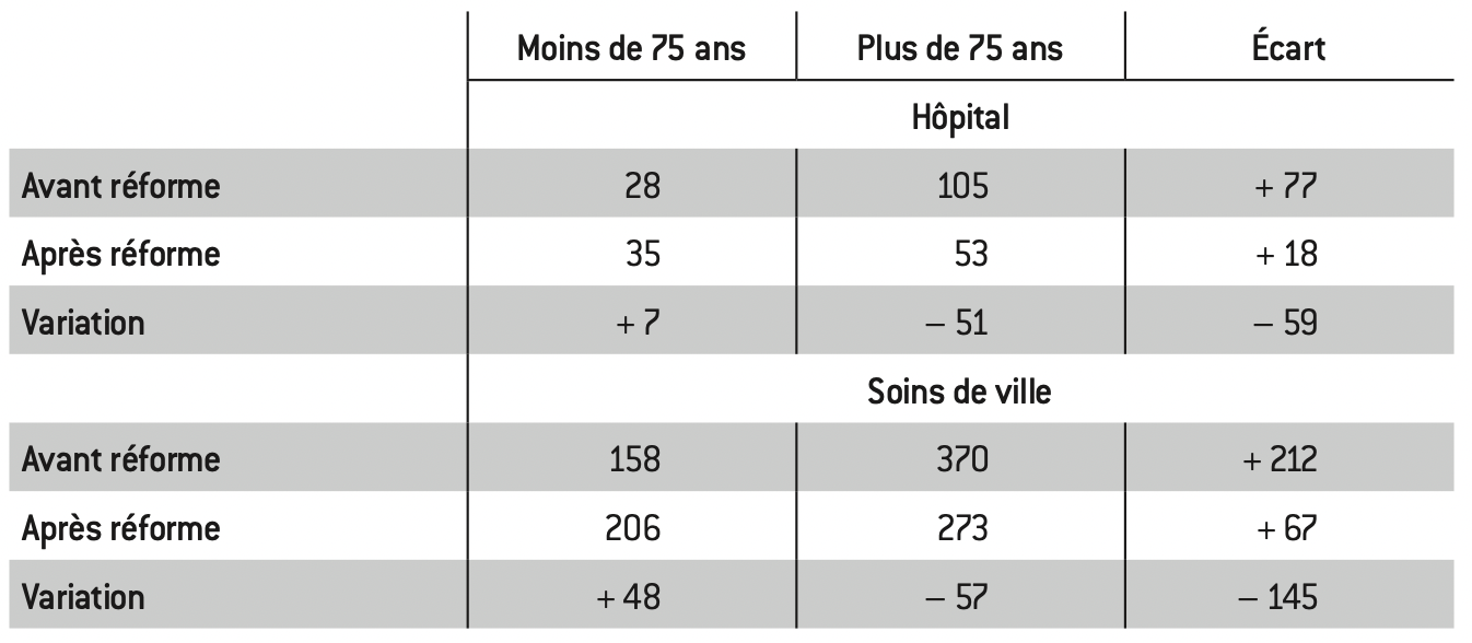 « En 2015, la dépense moyenne d’un homme âgé de 70 à 74 ans est ainsi près de 8 fois plus élevée que celle d’un homme de 20 à 24 ans » (Juliette Grangier, Myriam Mikou, Romain Roussel et Julie Solard, « Les facteurs démographiques contribuent à la moitié de la hausse des dépenses de santé de 2011 à 2015 », Études & Résultats, n° 1025, septembre 2017, p. 2).