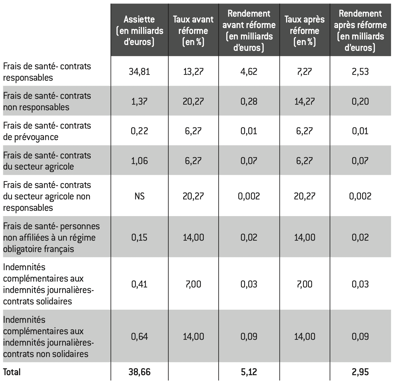 La TSA telle que nous la connaissons aujourd’hui est née de la fusion, en 2016, des anciennes TSA et TSCA. Son taux est fixé à 13,27% pour les contrats responsables et 20,27% pour les contrats non responsables (voir tableau 8).