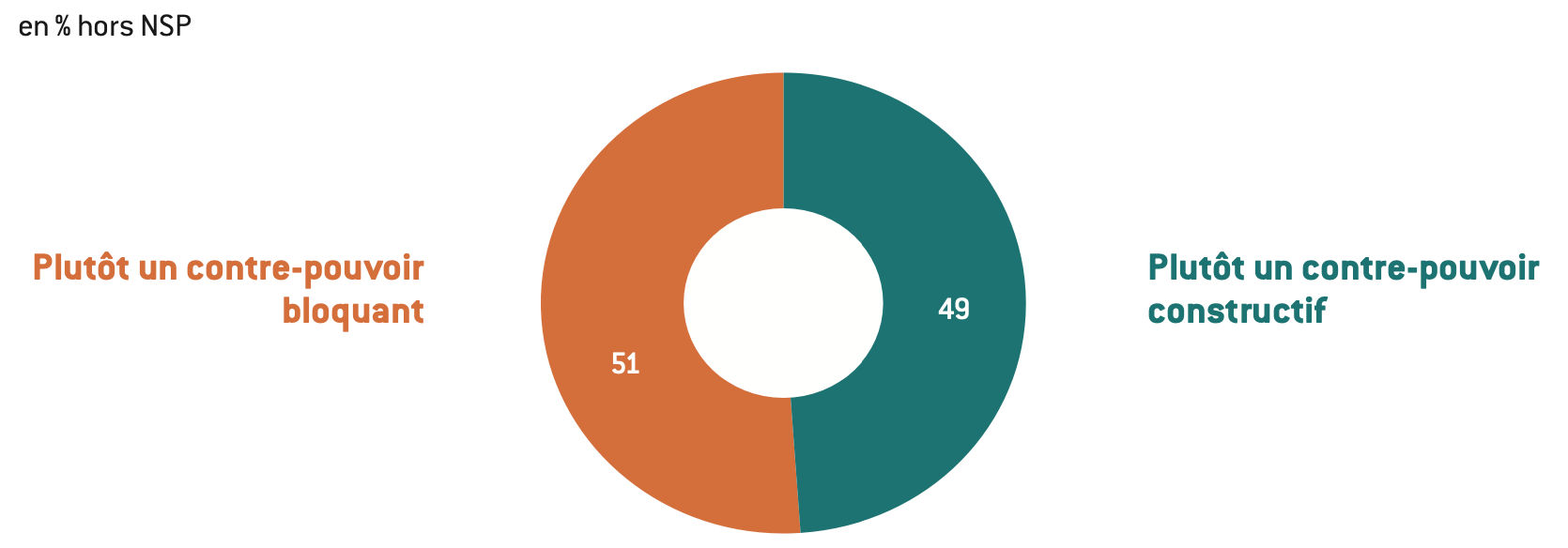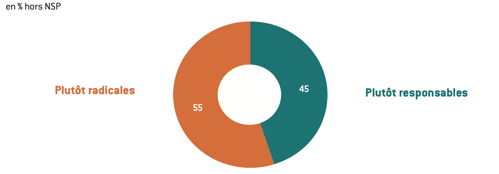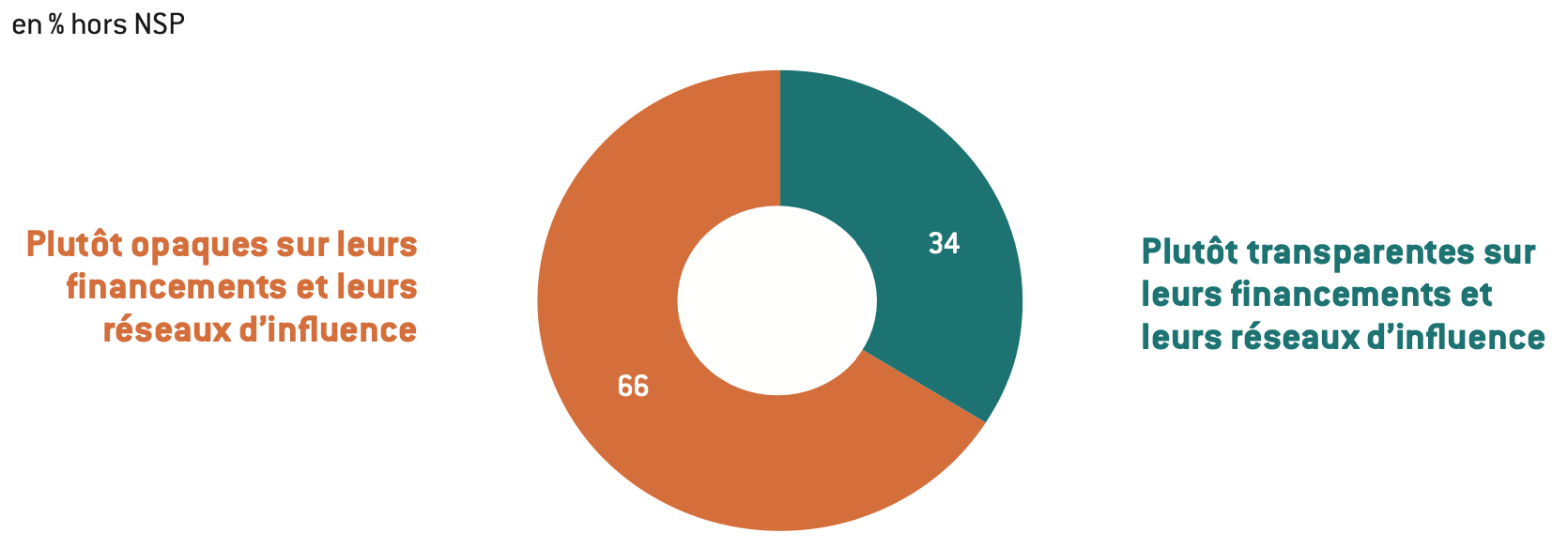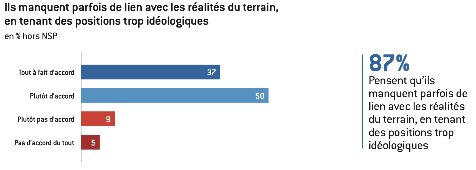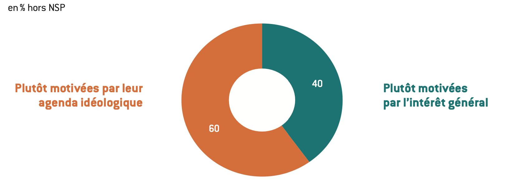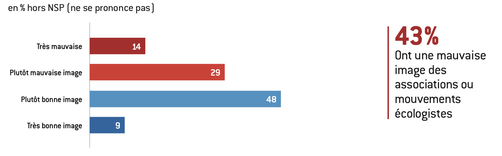 Si la majorité (57%) des Français ont « une bonne image des associations ou mouvements écologistes », ce jugement positif est largement contrasté par le fait que c’est aussi une majorité qui voit dans ces mouvements « un contre-pouvoir bloquant » (51%) plutôt qu’un « contre-pouvoir constructif » (49%), ou qui considère que « les associations environnementales en France sont plutôt radicales » (55%) et non pas « responsables » (45%) ; qu’elles sont « motivées par leur agenda idéologique » (60%) plutôt que « par l’intérêt général » (40%) ; qu’elles sont « opaques sur leurs financements et leurs réseaux d’influence » (66%) plutôt que transparentes (34%).