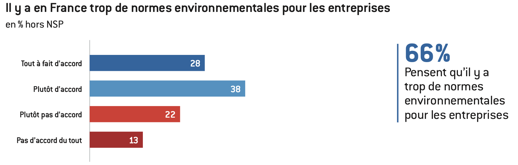 Les deux tiers (66%) des personnes interrogées répondent qu’« il y a en France trop de normes environnementales pour les entreprises ». Dans un environnement économique ouvert, l’écologisme est perçu comme un handicap pour nos entreprises. Pour la plupart (67%) des répondants, « les normes environnementales fragilisent l’industrie française en la rendant moins compétitive par rapport à d’autres pays ». De même, pour les trois quarts (73%) des répondants, « les normes environnementales imposent des contraintes administratives trop importantes aux entreprises ».