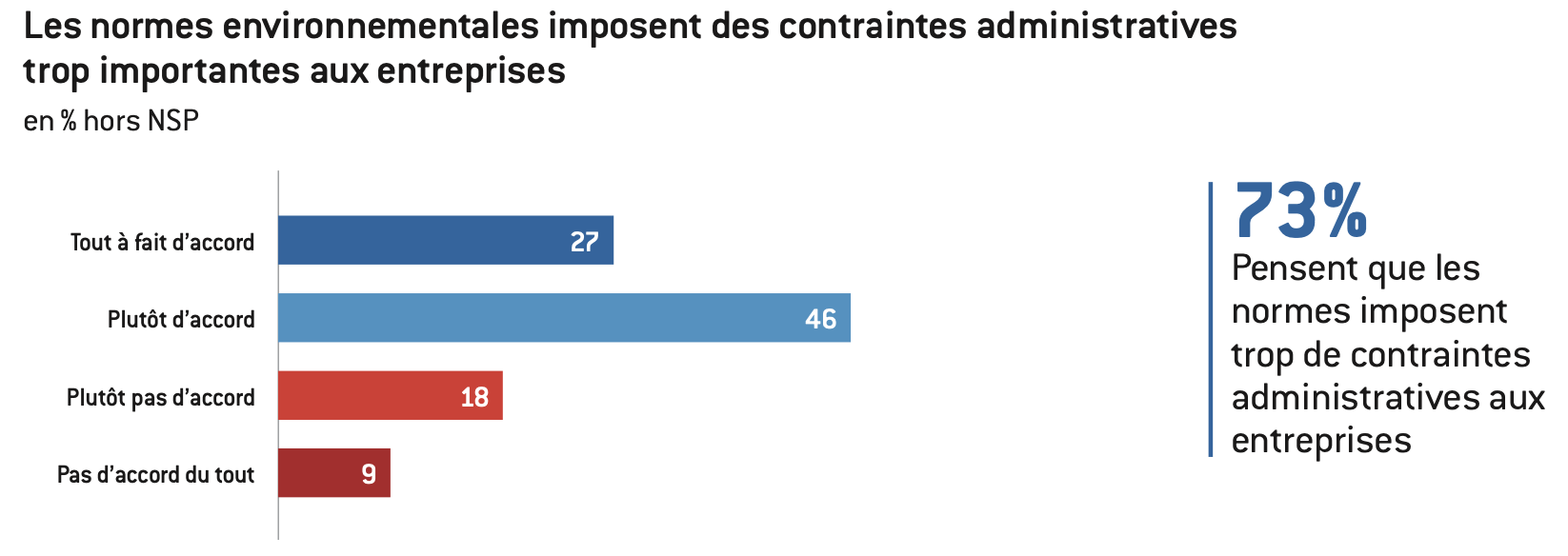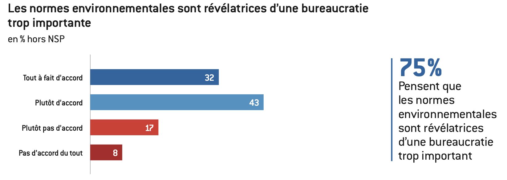 C’est notamment en raison de sa dérive normativiste que les politiques écologiques sont assimilées à un processus de bureaucratisation de la société. Pour 75% des répondants, « les normes environnementales sont révélatrices d’une bureaucratie trop importante ».