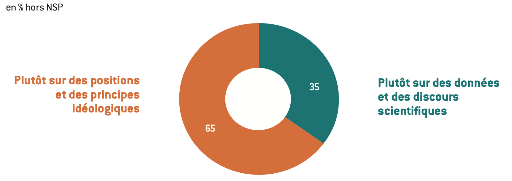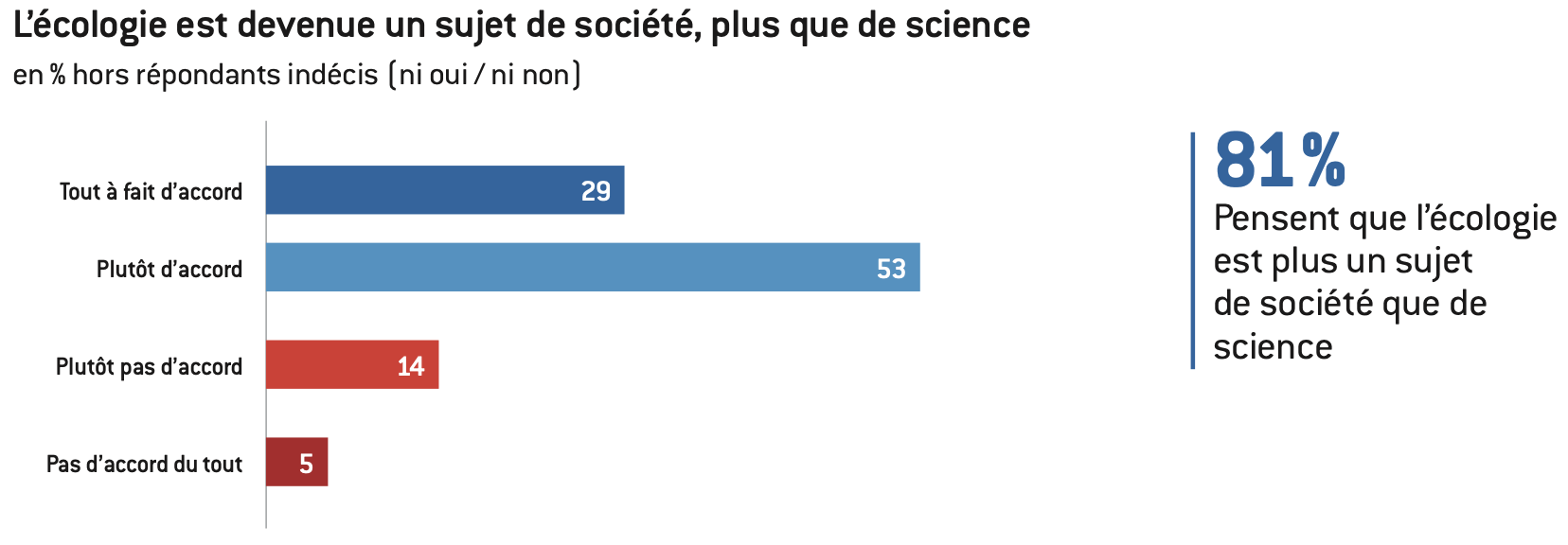 Sous l’effet de l’écologisme, la gestion publique des enjeux environnementaux a été détachée de la science et de l’innovation : 87% des personnes interrogées estiment que « les mouvements ou associations écologistes en France manquent parfois de lien avec les réalités du terrain, en tenant des positions trop idéologiques ». Dans des proportions comparables (81%), les personnes interrogées estiment que « l’écologie est devenue un sujet de société, plus que de science ». De même, quand des mouvements écologistes s’opposent à des projets industriels, c’est « plutôt sur des positions et des principes idéologiques » (65%) que « sur des données et des discours scientifiques » (35%).