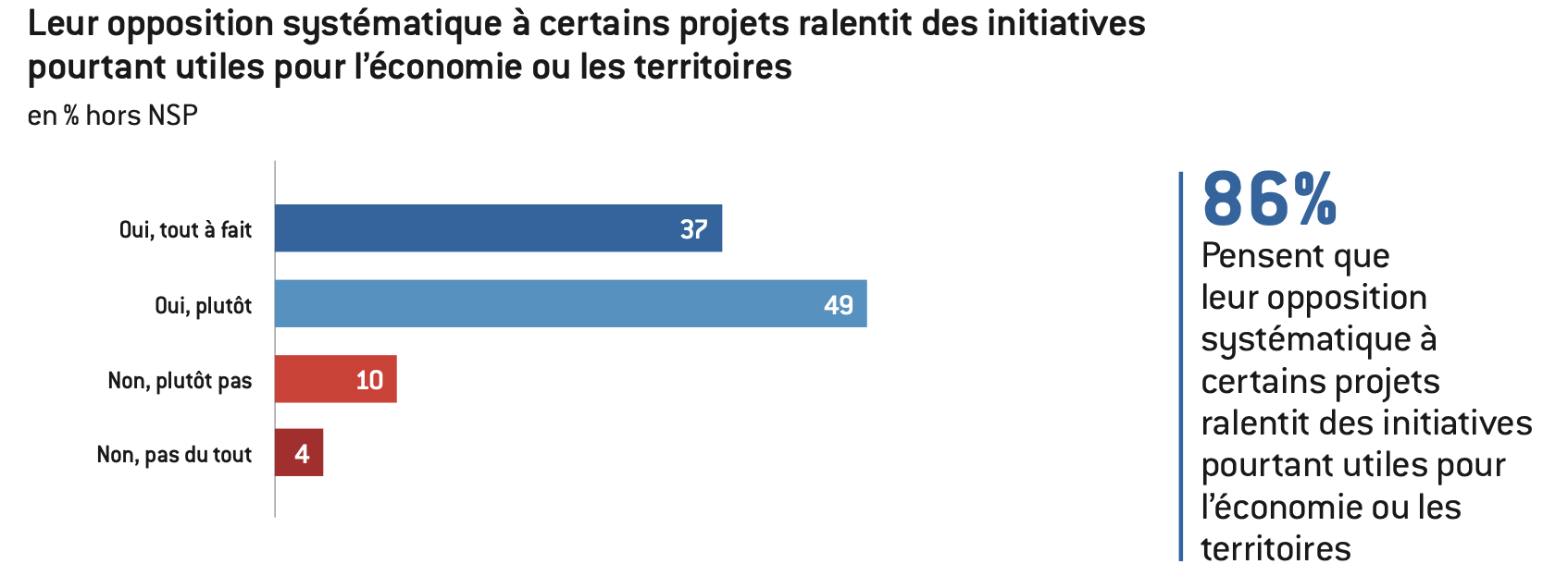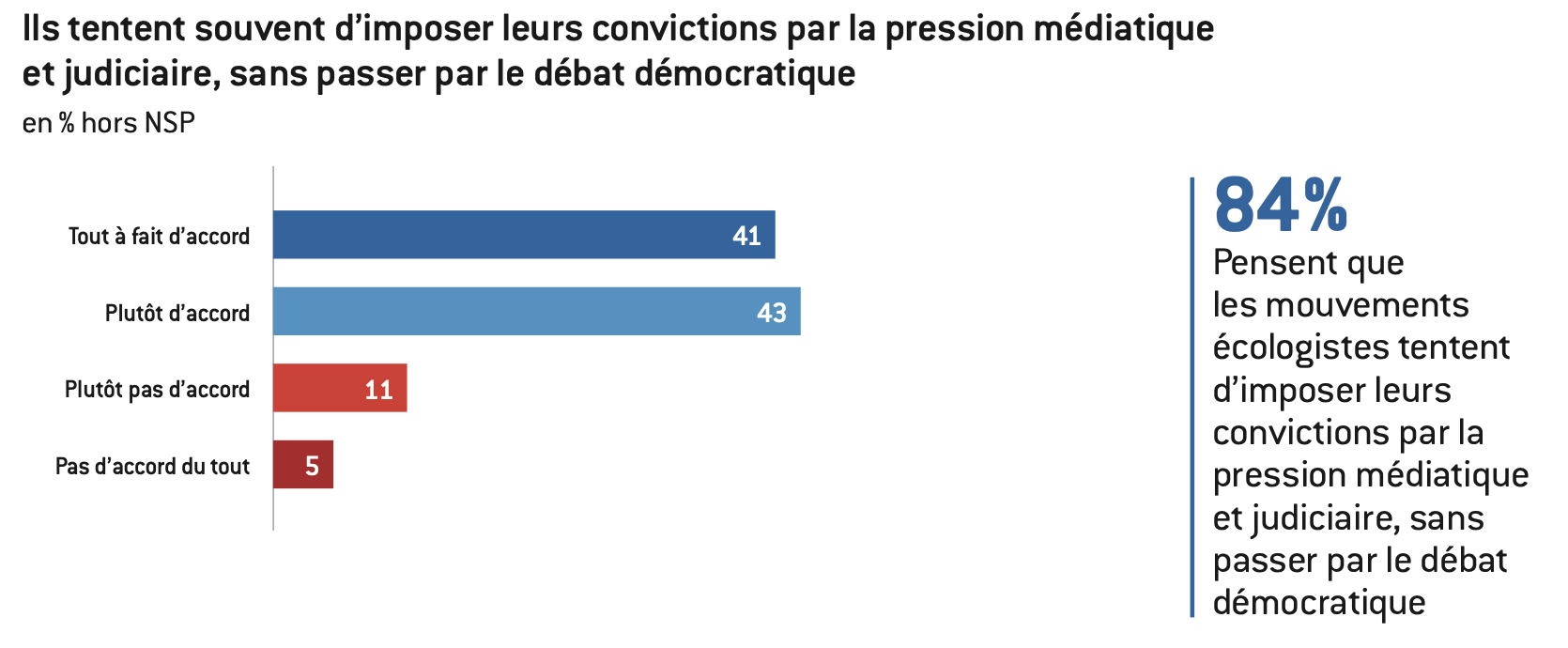 L’opinion publique voit dans l’écologisme un radicalisme politique aux conséquences socialement injustes et économiquement dangereuses : 86% des répondants estiment que l’opposition systématique des écologistes « à certains projets ralentit des initiatives pourtant utiles pour l’économie ou les territoires ».