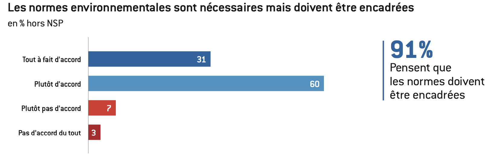 Ainsi, pour les trois quarts des personnes interrogées (75%) « les normes environnementales sont révélatrices d’une bureaucratie trop importante ». Pour 91% d’entre elles, « les normes environnementales sont nécessaires mais doivent être encadrées ». Cette réponse quasi unanime exprime la dénonciation d’un écologisme agissant puissamment sans légitimité électorale correspondante, et basculant donc dans un dirigisme, voire un autoritarisme administratif et règlementaire. Les normes environnementales sont perçues comme un pouvoir qui mérite un contre-pouvoir, un « encadrement », c’est-à-dire des limites à la puissance du normativisme écologiste.