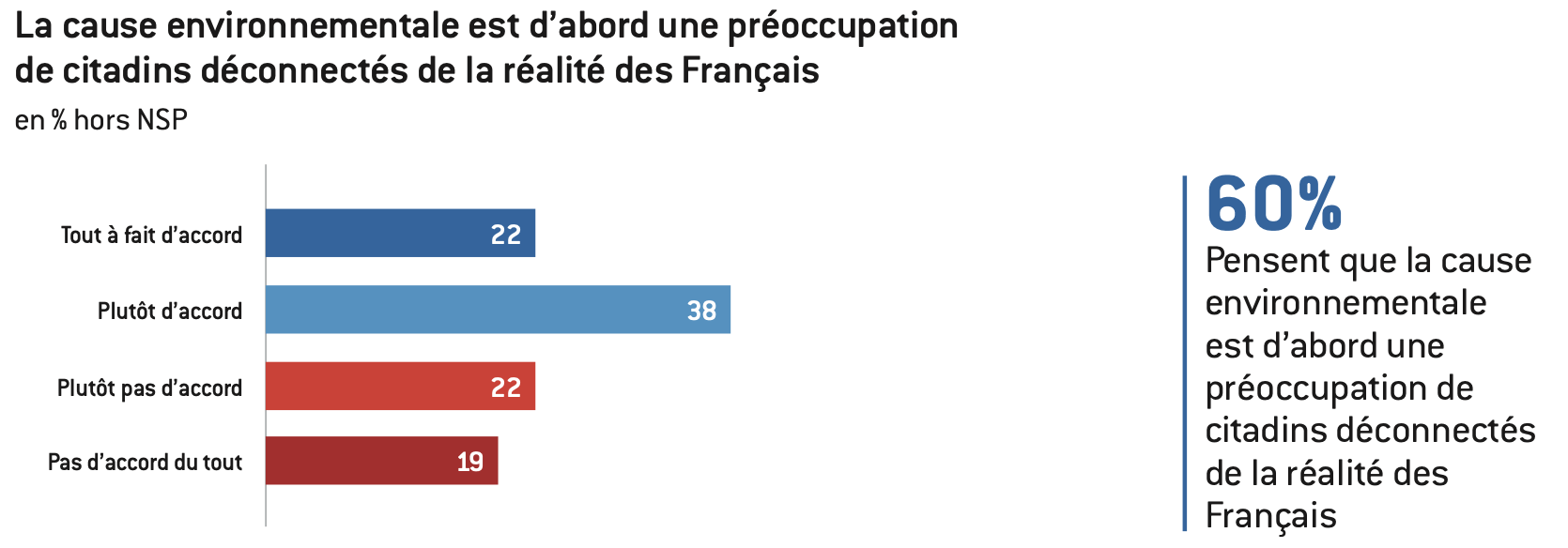 L’enquête confirme la coupure, voire la rupture entre une petite minorité de Français, assimilée à un particularisme social, si ce n’est une sorte d’élite sociale, soutenant cet écologisme bureaucratique et anti-économique, et le reste de la société qui le rejette : pour 60% des personnes interrogées « la cause environnementale est d’abord une préoccupation de citadins déconnectés de la réalité des Français ».