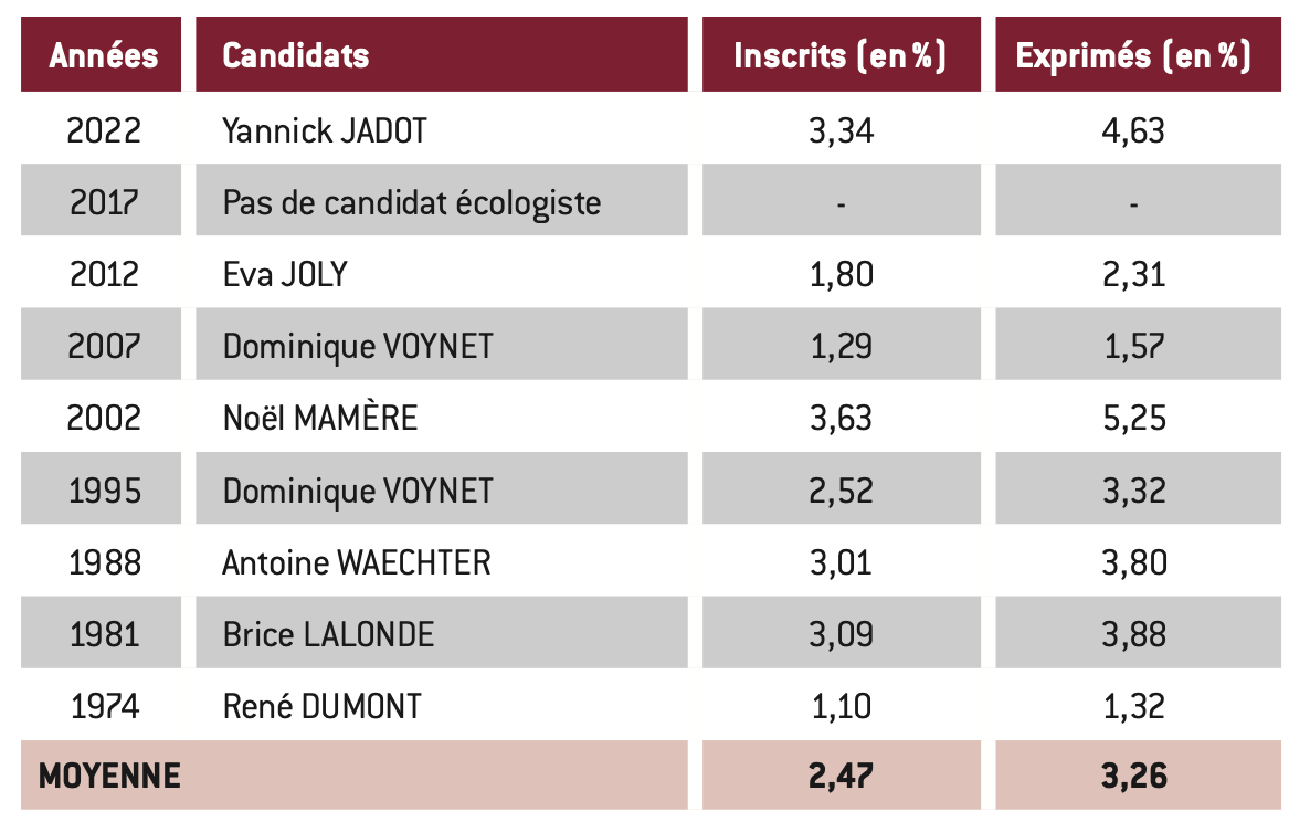 Compte tenu du rôle de l’élection présidentielle dans notre système politique, nous pouvons ici la considérer comme le témoignage principal. En effet, depuis 1965, on constate aisément que les 8 candidatures écologistes qui se sont succédé n’ont pu produire qu’un score moyen de 3,2% des suffrages exprimés, soit 2,5% des électeurs inscrits. Sur le plan électoral, l’écologisme politique est donc resté marginal dans le pays, n’accédant vraiment au pouvoir que dans quelques villes seulement ou n’ayant qu’un rôle d’appoint arithmétiquement indispensable dans certaines coalitions fragiles, rôle négocié contre des pièces clés de son programme. Dans ce type de configuration, l’écologisme offre une illustration de la théorie de la tyrannie des minorités. Une distorsion aussi ancienne, constante et nette entre le pouvoir d’influence politique et médiatique dont a pu tirer profit un courant politique électoralement marginal est certainement l’une des causes du procès en illégitimité de l’écologisme mais aussi plus fondamentalement l’une des sources de la critique montante du dysfonctionnement de la démocratie s’il apparaît ainsi au grand jour que la norme et les contraintes peuvent être décidées, définies et imposées par d’étroites minorités électorales. En d’autres termes, la question se pose de savoir pourquoi, ou à quel titre, un courant électoralement insignifiant, et depuis si longtemps, parvient à bénéficier d’une considération politique et médiatique que l’on pensait réservées à de grands partis ou à de grands électorats1.