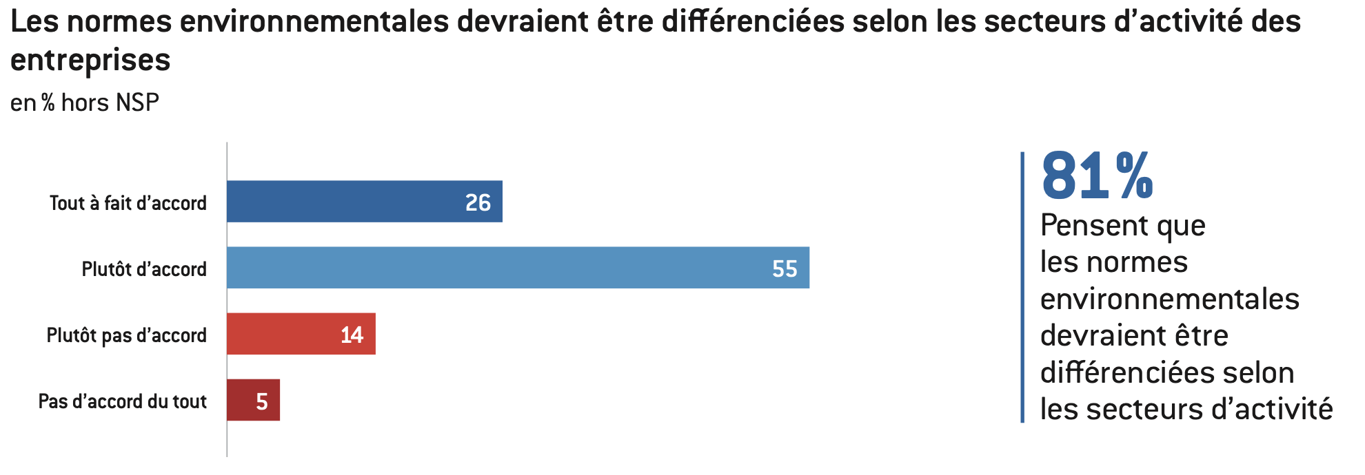 Les deux tiers des Français estiment que cela passe d’abord par la réduction du nombre de normes (66%) et les trois quarts (73%) qu’il faut aussi alléger ces normes qui « imposent des contraintes administratives trop importantes aux entreprises ». Enfin, opposés à une politique de normes uniformisantes, 81% des Français interrogés jugent au contraire que « les normes environnementales devraient être différenciées selon les secteurs d’activité des entreprises ».
