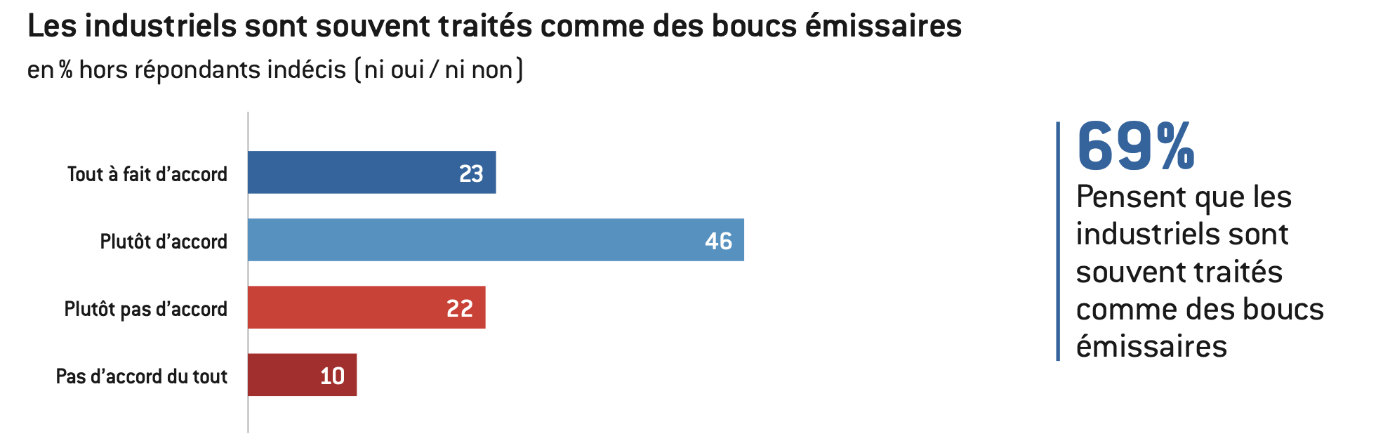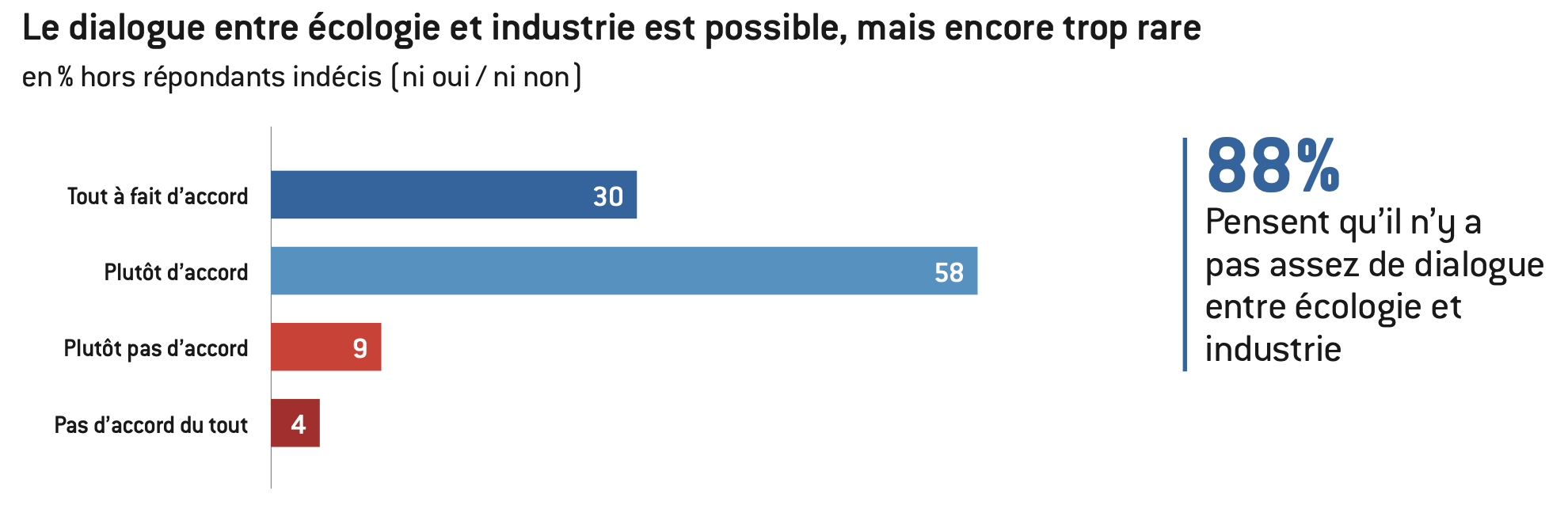 C’est le sens de la critique très largement partagée dans l’opinion publique (69%) selon laquelle « les industriels sont souvent traités comme des boucs émissaires », c’est aussi le sens du soutien massif (88%) à l’idée que « Le dialogue entre écologie et industrie est possible, mais encore trop rare ». C’est pourtant ce dialogue qui peut sauver l’économie et l’écologie de l’écologisme2.