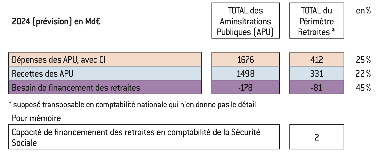La note détaille le besoin de financement actuel aux bornes du système des retraites et sa contribution importante (-69 Mds d’euros en 2023 et -81 Mds d’euros prévus en 2024) au déficit des administrations publiques, comparable aux années antérieures mais accru en 2024 par l’indexation des prestations.
