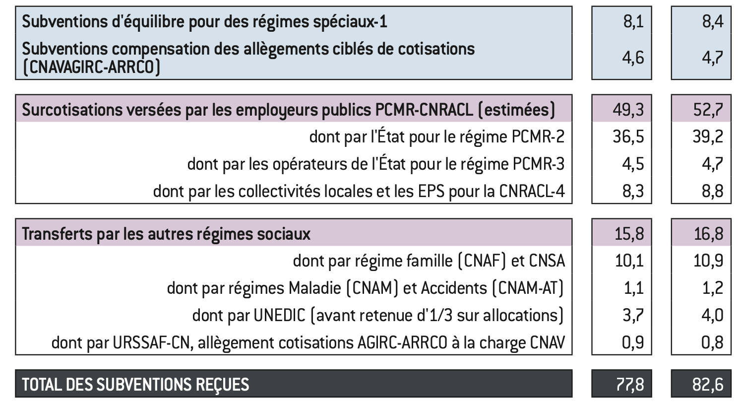La branche vieillesse, élargie aux retraites complémentaires, est bénéficiaire de ces mouvements. Le tableau ci-dessous, récapitule les subventions reçues par des régimes de retraites provenant des autres administrations de Sécurité sociale. Elles ne concourent pas toutes au déficit de la Sécurité sociale puisqu’à l’intérieur des régimes obligatoires de base de la Sécurité sociale, 10,4 Mds d’euros s’annulent, mais elles en modifient fortement les soldes par branche, notamment entre la famille et la vieillesse. Elles font en revanche bien toutes partie de la contribution spécifique du système de retraites aux déficits publics, car les dépenses de subvention des autres branches ne peuvent être comptées deux fois avec la dépense de retraites.