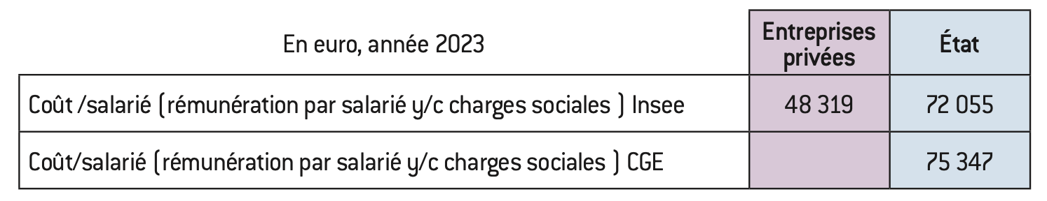 D’abord, ce n’est pas une présentation réaliste de dire que les employeurs publics calculent ou versent et comptabilisent dans leurs charges de personnel, des contributions, cotisations imputées ou cotisations aux deux régimes spéciaux de Sécurité sociale des fonctionnaires, de l’ordre de 100% ou 50% des traitements bruts4, alors que tous les autres actifs français cotisent à 28% (25% après allègements). Cette présentation des comptes surcharge très sensiblement le coût des fonctionnaires actifs, qui, pour l’État, reviennent à 50% de plus par employé que le coût tout compris d’un salarié en moyenne en France.