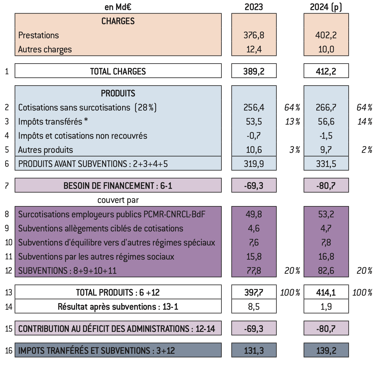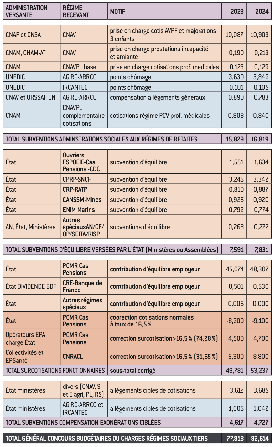 Un reclassement des produits du compte global des retraites est donc nécessaire par réduction des cotisations de 4,5 Mds d’euros en 2023 et de 4,7 Mds d’euros en 2024 et par prise en compte de subventions d’égal montant, en réalité à la charge indirecte de l’État pour l’essentiel.