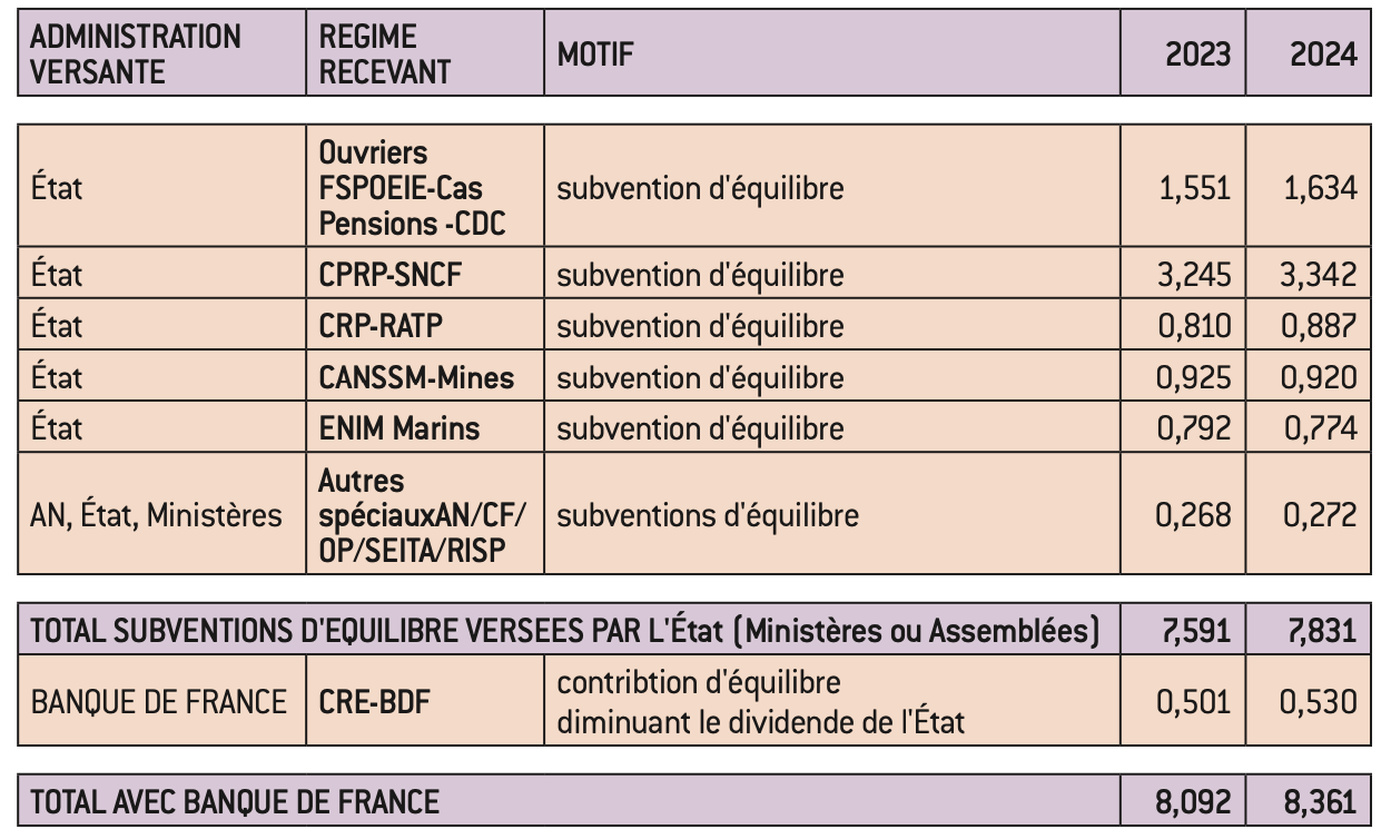 L’État verse directement dans la mission Régimes sociaux et de retraites, au travers des crédits de certains ministères, des assemblées ou par renonciation contractuelle aux dividendes de la Banque de France, des subventions de 8,1 Mds d’euros en 2023 et 8,4 Mds d’euros en 2024, pour sept régimes spéciaux.