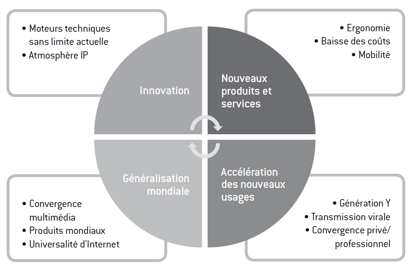 La transformation de l’économie mondiale sous la poussée des techniques numériques est un processus qui s’est amorcé dans les années 1980 pour s’accélérer brutalement avec l’émergence d’Internet et du Web depuis 1995. Néanmoins, la prise de conscience de l’ampleur des conséquences systémiques de cette transformation sur la société française au sein de l’Union européenne est relativement récente. Les instruments classiques d’analyse et de projection sont inopérants face à la rapidité des mutations engendrées par les usages, qui dépassent la capacité d’analyse et de réaction de la plupart des acteurs. Ainsi, personne n’a vraiment vu venir le succès des smartphones, qui sont en fait des ordinateurs mobiles dotés de moyens de communication voix et données, et leur impact sur la plupart des activités économiques. Il en sera de même avec la vague d’innovations qui vont marquer les prochaines années autour du haut débit mobile, de la 3D et de « l’informatique en nuage » (cloud computing) pour ne citer que les plus visibles et les plus attendues. La miniaturisation des composants, la multiplicité des situations d’usage des technologies vont encore accélérer la dimension globale de la numérisation, qui imprègne tous les secteurs, toutes les activités. Plus encore, l’accélération du rythme des innovations recèle de nouvelles ruptures, encore insoupçonnables.
