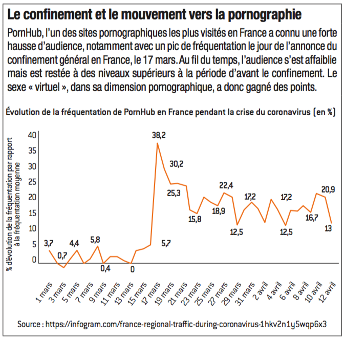 Néanmoins, la sociabilisation par écrans interposés est loin d’avoir gagné l’ensemble de la société : mi-avril, seuls 10% des Français déclaraient avoir eu chaque jour ou pratiquement chaque jour des activités sociales ou sportives en ligne, tandis que plus des deux tiers (69%) n’en n’ont jamais eues24. Au-delà de l’évidence des inégalités de situation quant au capital social octroyé par les ressources numériques, la réalité de ces chiffres renvoie aussi à l’incapacité de ces dernières à suppléer à la communication en présence physique. Le psychiatre Serge Tisseron invite à ne pas opposer ces deux voies de communication et à les considérer plutôt comme « complémentaires », à accepter que s’effacent peu à peu les frontières entre le monde réel et le monde virtuel, ouvrant ainsi des opportunités pour « désenclaver » l’espace des relations possibles25. De toute évidence, il y a là un réservoir pour que s’inventent des façons d’être ensemble, de s’entraider, d’échanger, pour trouver aussi une certaine liberté, voire davantage d’autonomie relationnelle et affective. Mais cela n’est pas sans modifier les possibilités de notre intimité. Celle-ci se vit et se ressent par les seuils et les barrières qu’elle érige ou qu’elle abaisse entre soi et les autres ; elle autorise ou non leur franchissement par le geste, le contact. Preuve en est que la proximité physique des couples confinés n’a pas entraîné un épanouissement de leur pratique sexuelle, tout au contraire. Et l’exposition à des sites pornographiques a même augmenté vigoureusement au début du confinement pour baisser ensuite mais rester à un niveau supérieur de la fréquentation observée avant l’épidémie.