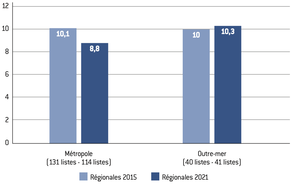 Tout d’abord, il faut signaler que les élections régionales et départementales de 2021 se distinguent de celles de 2015 par un moins grand nombre de candidats. Aux élections régionales de 2015, 171 listes (131 en métropole et 40 pour la Guadeloupe, la Martinique, la Guyane et la Réunion) s’étaient affrontées, contre seulement 155 en 2021 (114 en métropole et 41 en outre-mer). Cette baisse correspond à peu près à la diminution d’une liste par région (voir graphique 1). En métropole, la moyenne du nombre de listes est passée de 10,1 à 8,8 dans les treize régions issues du redécoupage de 2015.