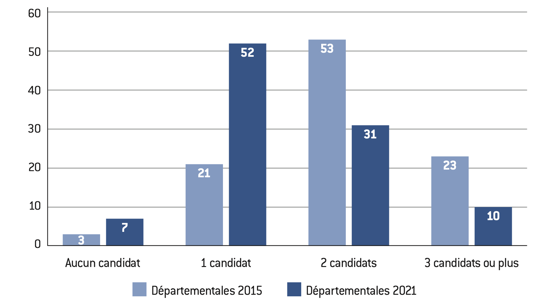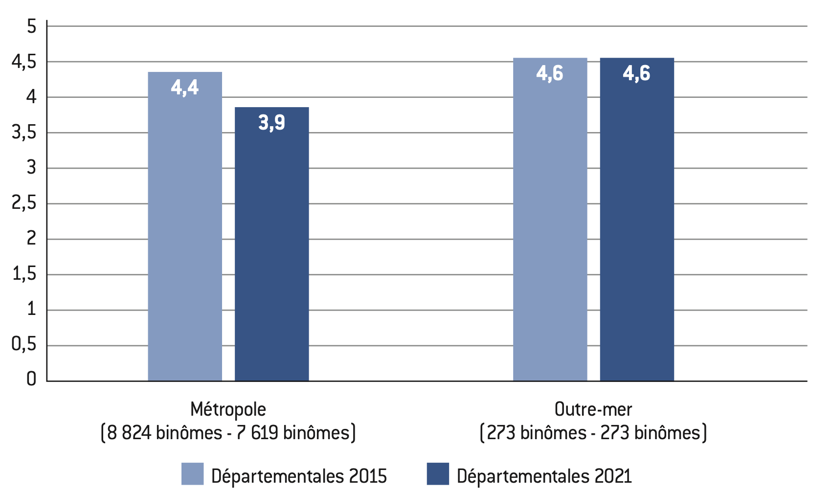 En ce qui concerne les élections départementales, 8.824 binômes s’étaient affrontés en 2015 en métropole, soit 4,4 binômes par canton, tandis qu’en juin 2021, il n’y avait plus que 7.619 binômes dans les 1.969 cantons métropolitains, soit 3,9 binômes par canton4 (voir graphique 2). Comme pour les élections régionales, on dénombre en outre-mer quasiment le même nombre de candidatures en 2015 et en 20215.