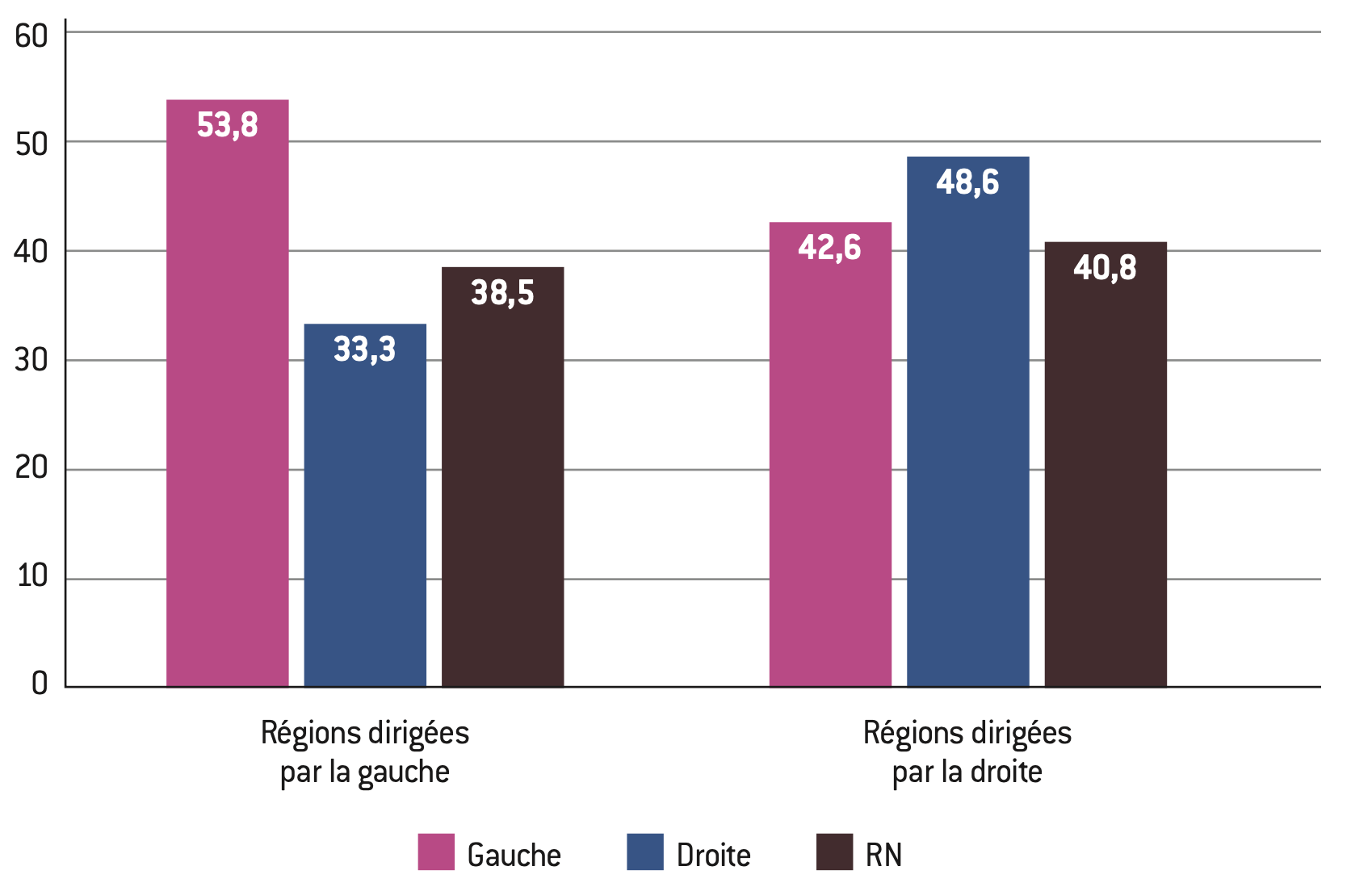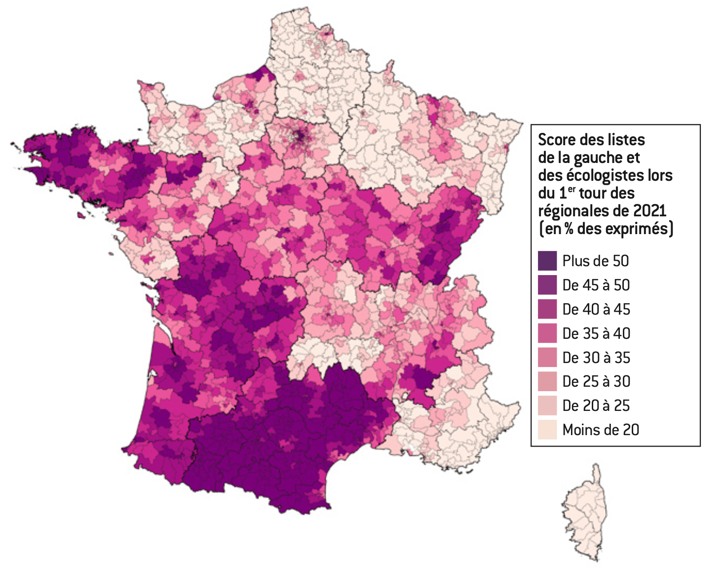 De la même manière, la droite règne presque sans contestation dans les Hauts-de-France (30,4 points d’avance), en Auvergne-Rhône-Alpes (21,6 points d’avance), en Normandie (18,1 points d’avance), dans le Grand Est (19,1 points d’avance69) et en Provence-Alpes-Côte d’Azur où la gauche a dû se retirer pour barrer la route au RN. Dans ces différentes régions, seules les métropoles et les grandes villes (Lille, Rouen, Grenoble) penchent en faveur de la gauche.