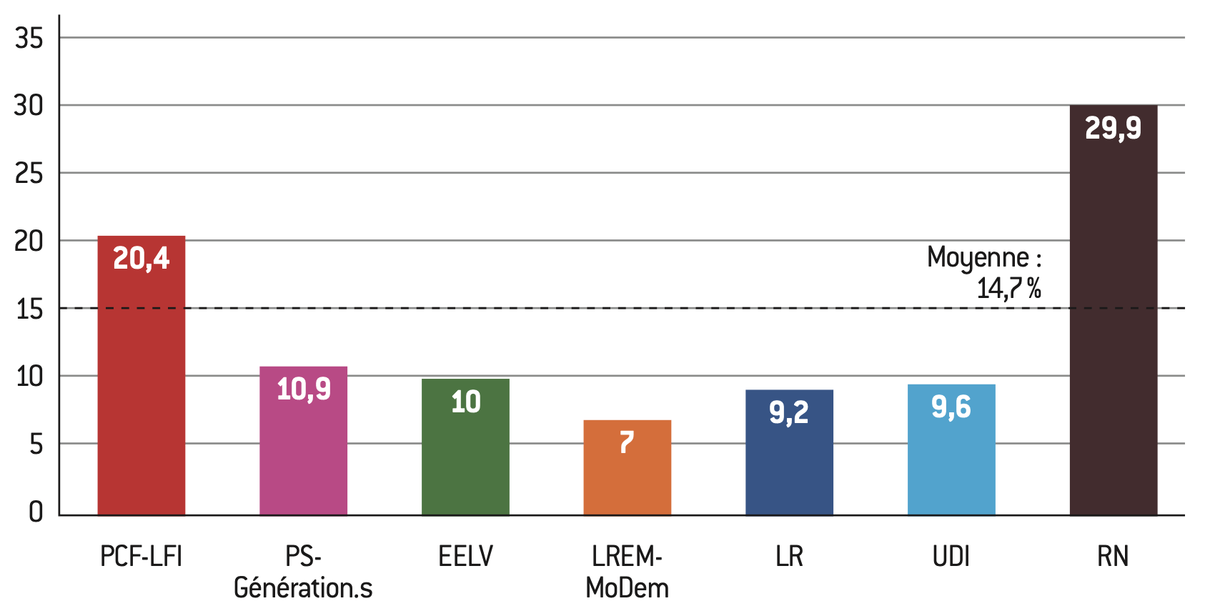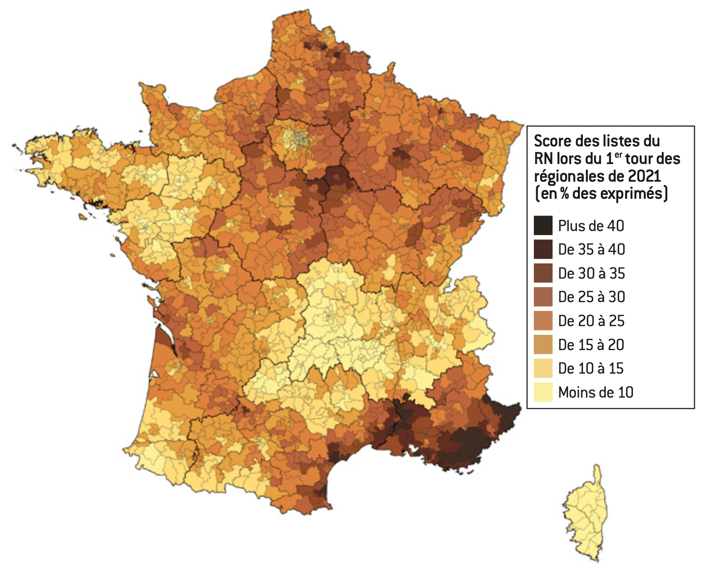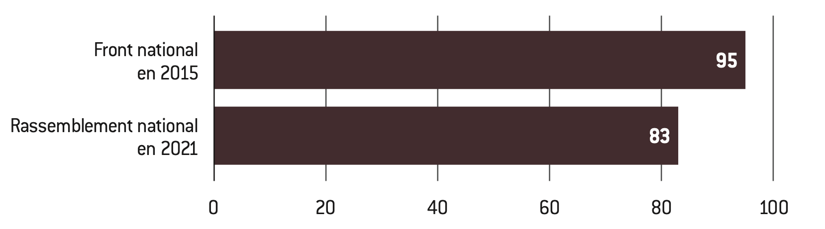 À l’instar des élections municipales de 2020 au cours desquelles il avait présenté moins de listes que lors des municipales de 201413, le RN n’a présenté que 1.642 binômes au premier tour des élections départementales de 2021 alors qu’il en alignait 1.896 sur la ligne de départ lors des élections de 2015. Cette décrue constitue un indice supplémentaire de l’état des forces militantes frontistes et de son éventuelle capacité à mobiliser sa base.