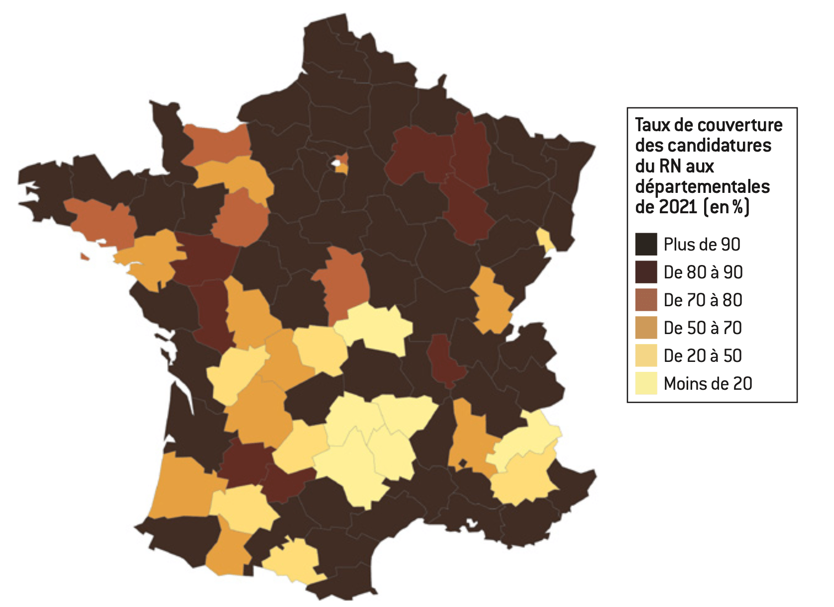 Cependant, avec un taux de couverture de 83%, le RN demeure le seul parti à présenter une telle couverture du territoire mais a dû se focaliser sur ses zones de forces (voir carte 1).