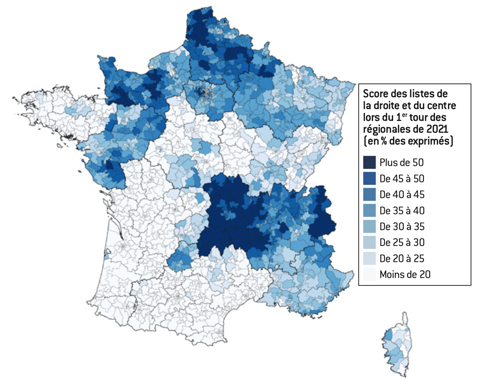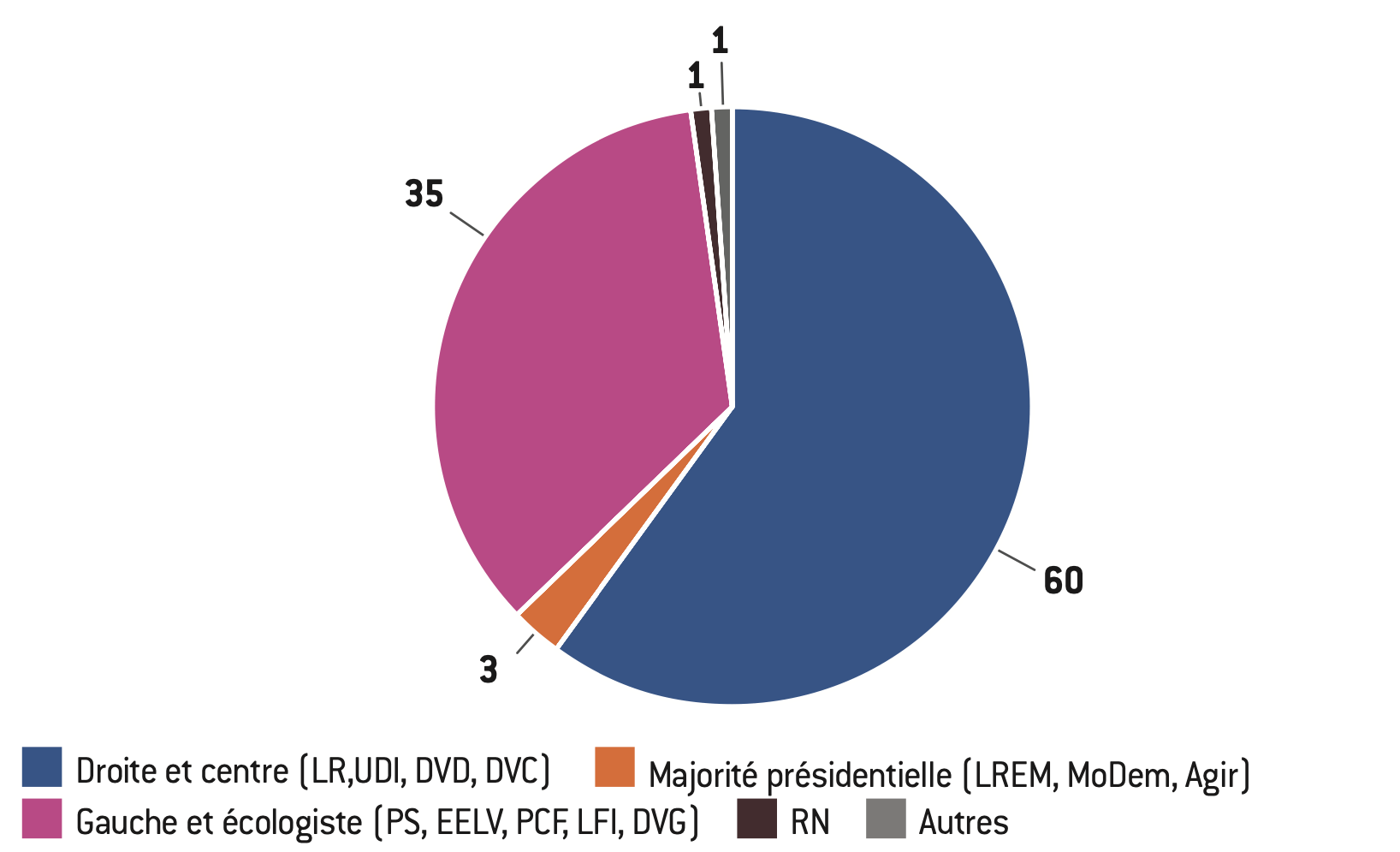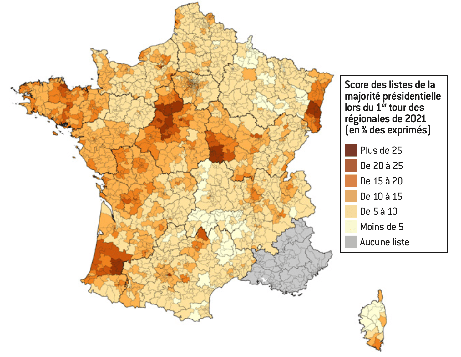 Marquées par une abstention historiquement forte, les élections régionales et départementales de juin 2021 se sont également distinguées par la réélection de l’immense majorité des sortants. En métropole, tous les exécutifs régionaux ont été reconduits, tandis que 83,8% des conseillers départementaux qui se représentaient ont été réélus. Seulement 8 conseils départementaux ont basculé (5 vers la droite, 3 vers la gauche), alors que la droite en avait conquis 26 en 2015. La configuration politique nationale, avec un président et un gouvernement centristes, a mis à l’abri la gauche et la droite d’un vote sanction. Généralement puissant lors des élections intermédiaires locales, ce vote sanction ne s’est donc abattu que sur le camp présidentiel, à l’implantation locale par ailleurs limitée. La droite et le centre (essentiellement LR et UDI), sortis largement vainqueurs des élections régionales et départementales de 2015, ont donc conservé leurs positions de pouvoir, tandis qu’à gauche le PS est parvenu à conserver les régions gagnées en 2015 malgré la concurrence accrue de EELV. Le parti écologiste a confirmé sa progression et obtenu un nombre inédit d’élus départementaux (100 conseillers départementaux en 2021, contre 27 en 2015).