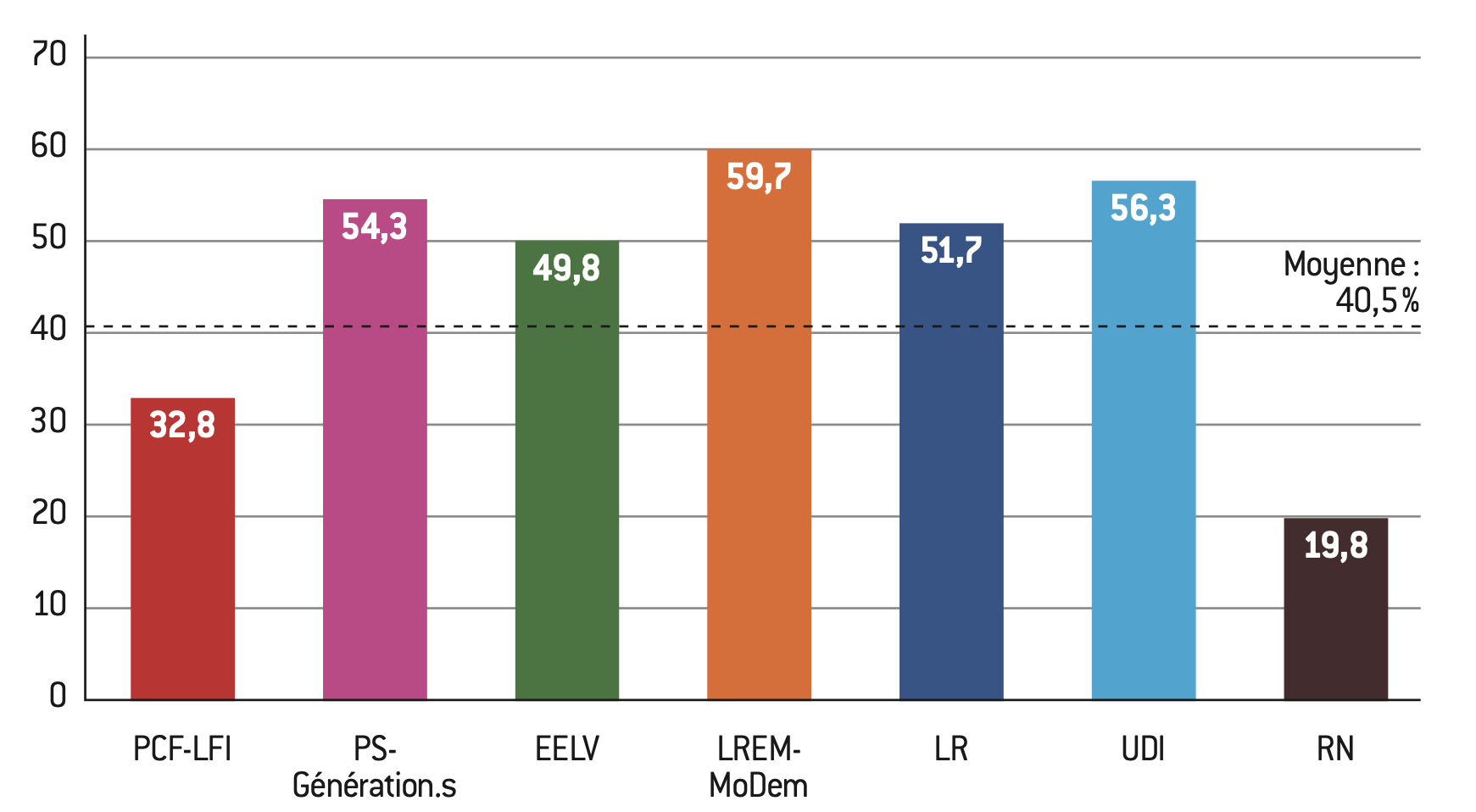 Nous avons vu précédemment qu’à gauche ces cantons sans concurrence se caractérisaient par une moindre audience de la gauche lors des élections européennes de 2019. Il en va de même pour le bloc de la droite et du centre (majorité présidentielle comprise), même si le phénomène de concurrence en fonction des scores réalisés par ce bloc est moins marqué qu’à gauche. On le voit, les partis de la droite et du centre profitent pleinement de cette absence de concurrence interne pour réaliser de bons (LR avec 43,7% des voix), voire d’excellents résultats (l’UDI avec 50,5%). Même LREM, dont les candidats étaient susceptibles d’être la cible d’un vote sanction, récoltent une part des suffrages correcte. Dans ces cantons, où l’audience cumulée de la droite et du centre se situait entre 30,9% et 32,8% aux élections européennes de 2019, le poids des sortants présentés par l’UDI (75% de candidats sortants) et par LR (54,5% de sortants) se fait nettement sentir65.