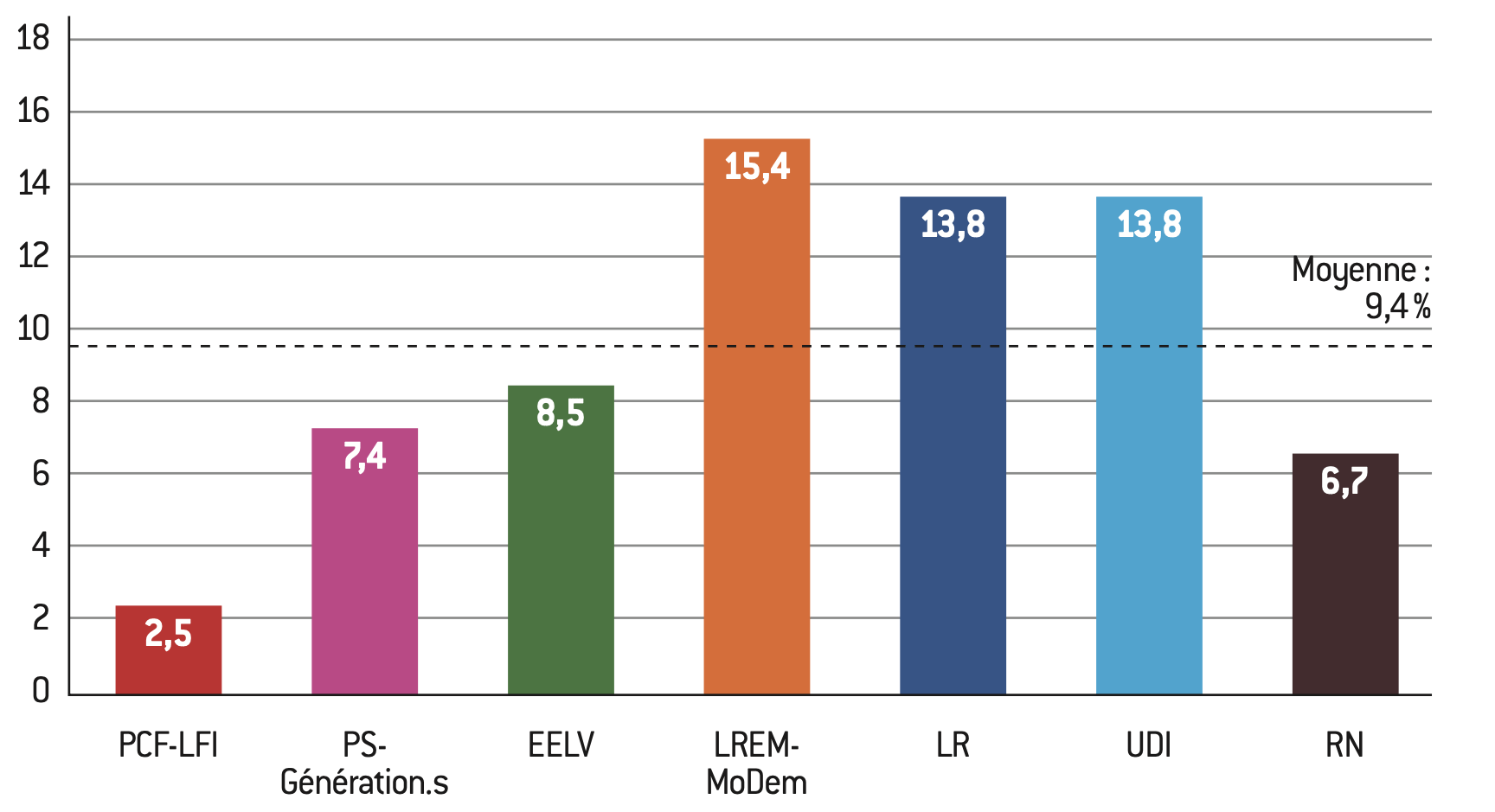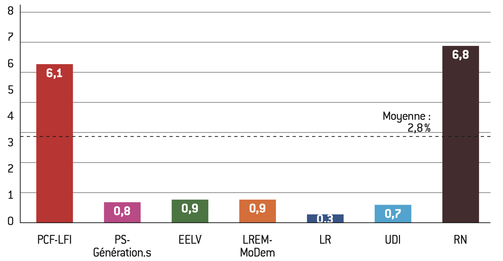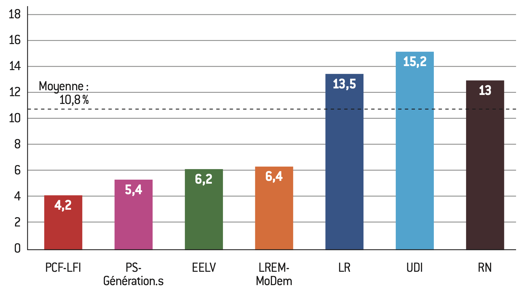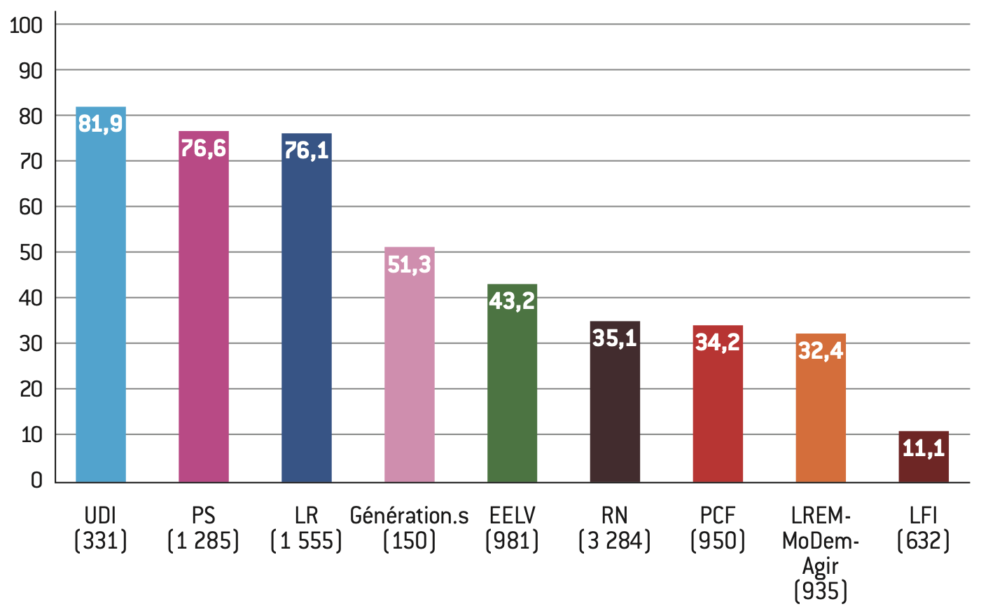 Aux élections départementales de 2021, le RN a présenté deux fois plus de candidats que LR, qui arrive deuxième au nombre des candidatures présentées avec 1.555 candidats dans des binômes présents dans 1.079 cantons (voir graphique 6)15. On note que les candidatures de LR sont nettement plus nombreuses que celles de leurs alliés centristes de l’UDI, qui n’ont présenté que 329 candidats au premier tour de ces élections répartis dans 299 cantons.