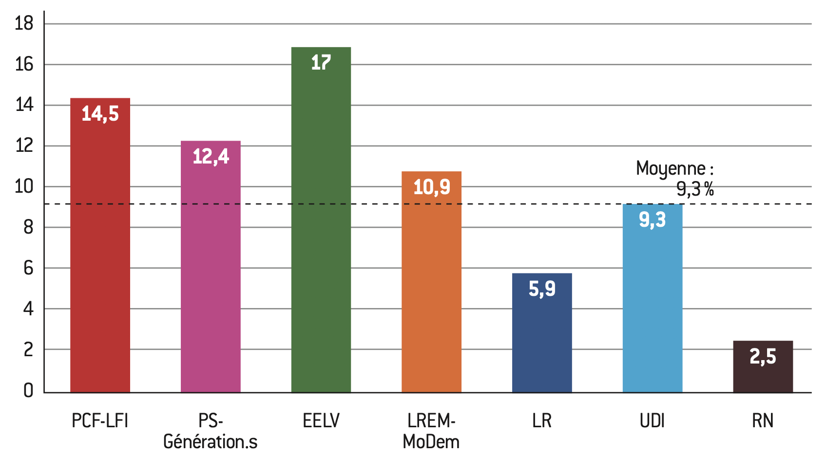 Les candidats se présentaient dans des zones ayant cumulé en moyenne des scores pour la gauche légèrement différents lors des élections européennes de 2019. Pour le PS, 30,3% ; pour EELV, 27% ; pour le PCF, 27,4% ; et pour LFI, 25,2%.