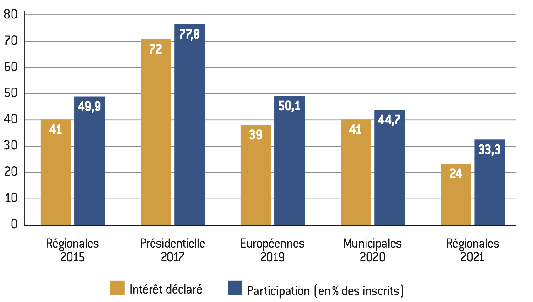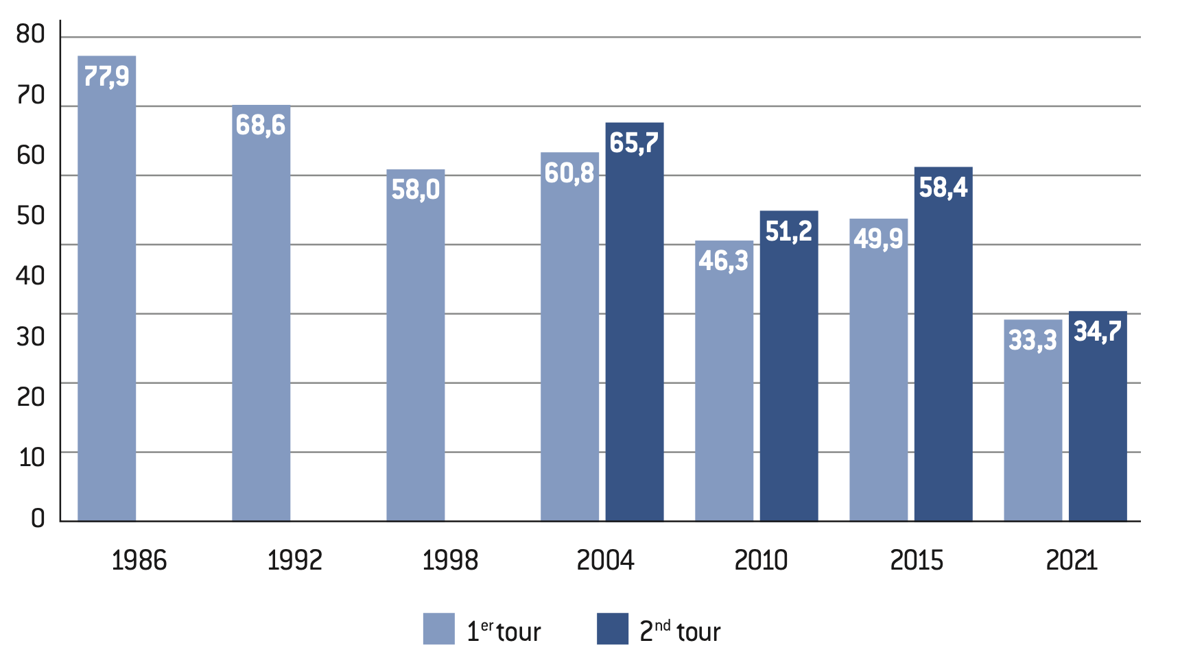 Le contexte politique dans lequel se sont déroulées ces élections a été très différent de celui des élections régionales et départementales précédentes. Lors des élections départementales des 22 et 29 mars 2015 et des élections régionales des 6 et 13 décembre 2015, Manuel Valls était alors le Premier ministre de François Hollande1. Ce duo, particulièrement impopulaire, notamment à gauche, a nourri un réflexe de vote sanction considérable qui a fait perdre au PS l’essentiel des gains territoriaux accumulés depuis le milieu des années 1990 au cours des différents scrutins cantonaux et régionaux2. À l’inverse, en 2021, les exécutifs départementaux et régionaux, dirigés par la droite et la gauche, n’ont pas été victimes d’un tel vote sanction puisqu’ils ne présentaient pas, pour les électeurs, de lien évident avec la majorité présidentielle macroniste alors en place.
