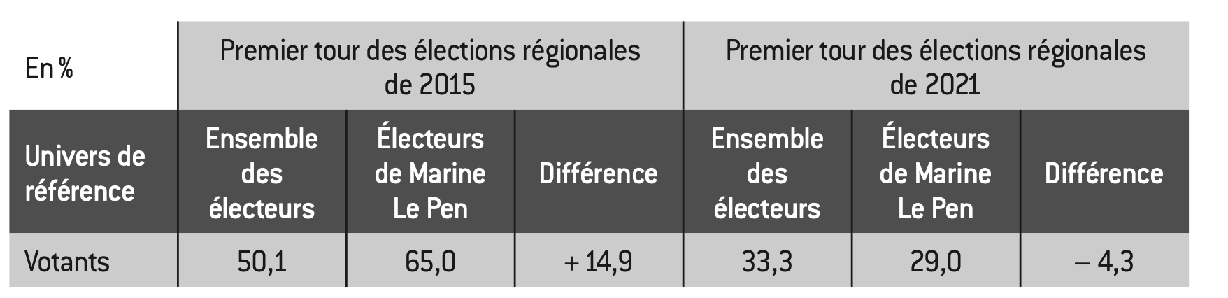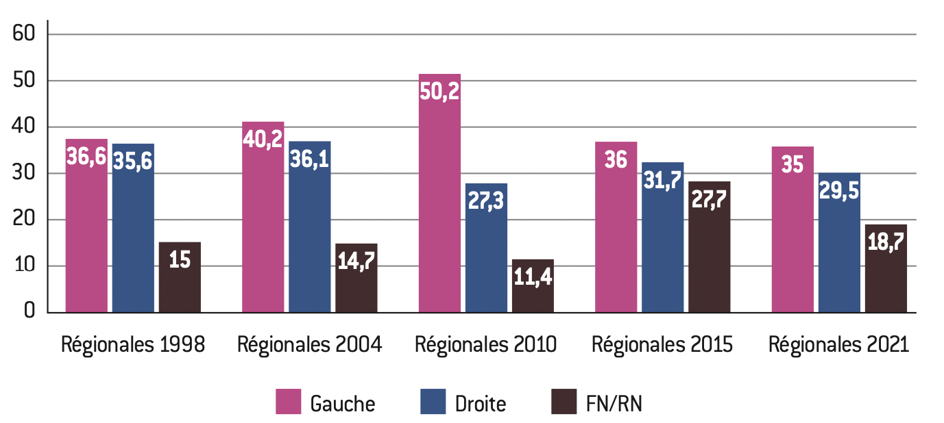 En 2021, le RN ne s’est pas qualifié pour le second tour en Corse. Le score du RN est donc calculé sur les 12 régions où ses listes étaient présentes. Si l’on ne considère que ces 12 régions, le score du FN change très peu (28%) eu égard au faible poids démographique de la Corse.