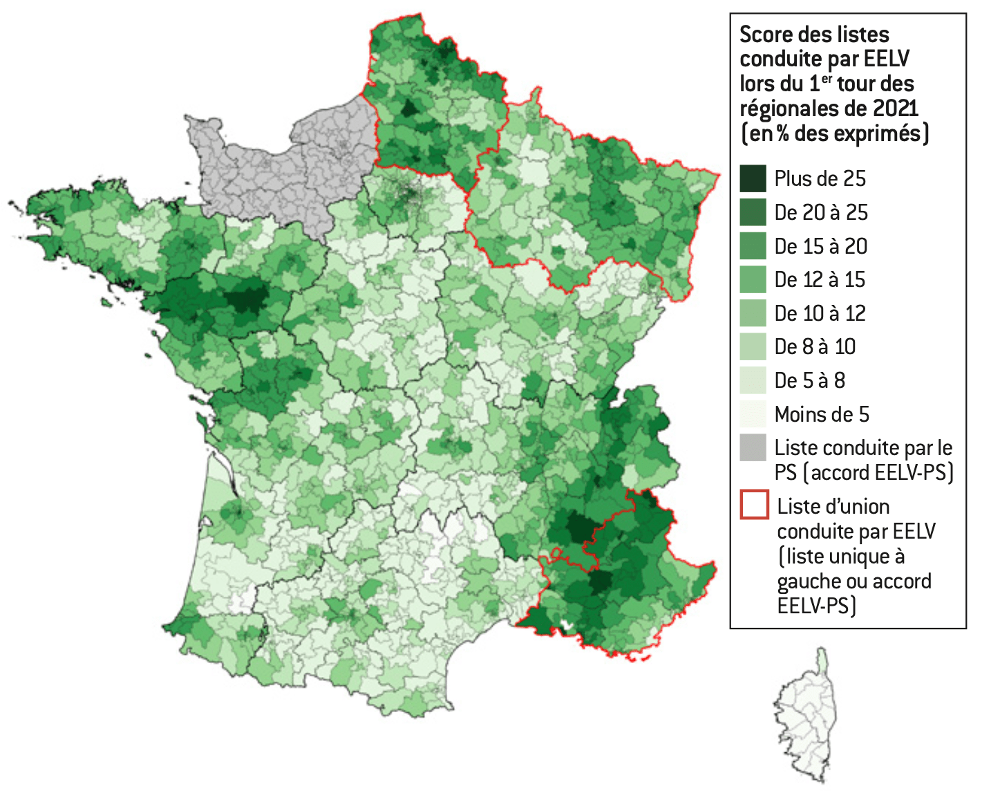 Dans les cinq régions qu’elle dirige, si la gauche s’est présentée moins divisée en 2021 du fait de la disparition des petites listes, ses trois principales composantes se sont néanmoins alignées séparément dans quatre régions (Bourgogne-Franche-Comté, Bretagne, Nouvelle-Aquitaine et Occitanie). Pour EELV, la volonté de faire valoir l’évolution du rapport de force au sein de la gauche, où l’affaiblissement du PS et la montée en puissance d’EELV se sont confirmés après 2017, a manifestement été plus forte dans les régions où la gauche était sortante. À l’inverse, les cadres du PS, en position de force, étaient sans doute moins intéressés pour faire des concessions afin de parvenir à une hypothétique union. À ce titre, le cas de l’Occitanie est éclairant : un an après l’accession des Verts au second tour des élections municipales à Toulouse, non seulement aucun accord de premier tour n’a été réalisé mais la liste régionale menée par le candidat écologiste à la mairie de Toulouse, Antoine Maurice, et celle de la présidente sortante de la région, Carole Delga, n’ont pas réussi à s’entendre en vue du second tour, pour lequel les listes EELV n’étaient pas qualifiées7.