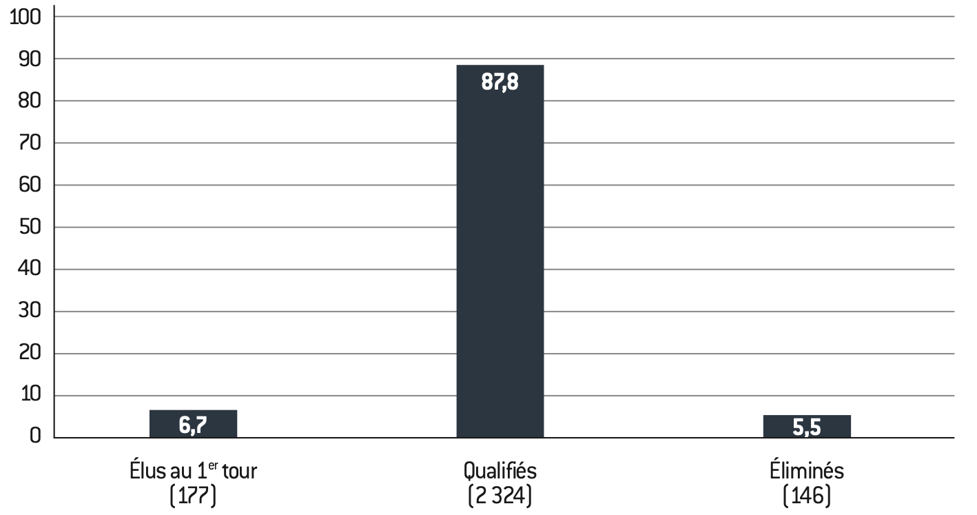 Parmi les 1.381 candidats auréolés du statut de maire mais non sortants, 36 ont été élus dès le premier tour (2,6%) et 1.058 se sont qualifiés pour le second tour, soit un taux de qualification de 76,6%.