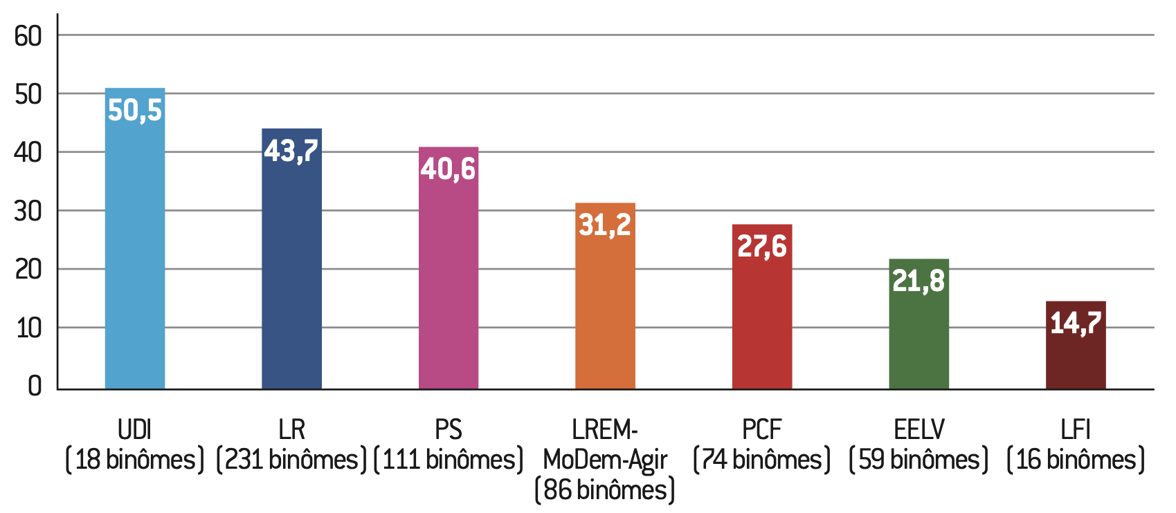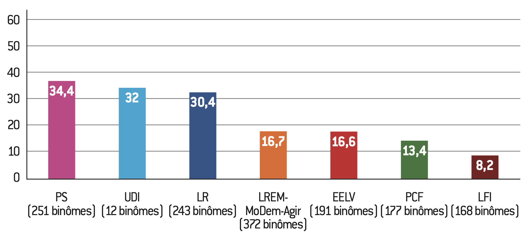 À gauche, si le PS réalise de meilleurs scores que les autres partis, ce n’est que partiellement en raison de candidatures dans des secteurs où le vote à gauche était plus fort en 201966. Un premier rapport de force s’est donc joué entre les partis de gauche pour se positionner sur des secteurs plus ou moins porteurs politiquement. La différence dans les votes récoltés par les binômes « unis » de gauche est ensuite à rechercher dans le nombre de sortants qui se présentaient. Ainsi, au PS, les binômes étaient composés à 46,8% de conseillers départementaux sortants, permettant ainsi de dépasser le potentiel électoral de 2019. Au PCF, 19,6% des candidats étaient sortants, ce qui a permis de réaliser de meilleurs scores que les binômes de EELV ou de LFI puisque aucun sortant ne se présentait pour ces deux partis.