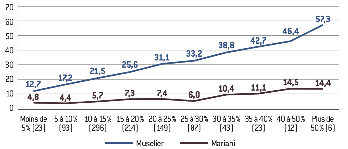 Graphique 29 : Évolution des scores pour les listes Muselier et Mariani en fonction du score de la gauche au premier tour des élections régionales de 2021 (en points de % des votes exprimés)