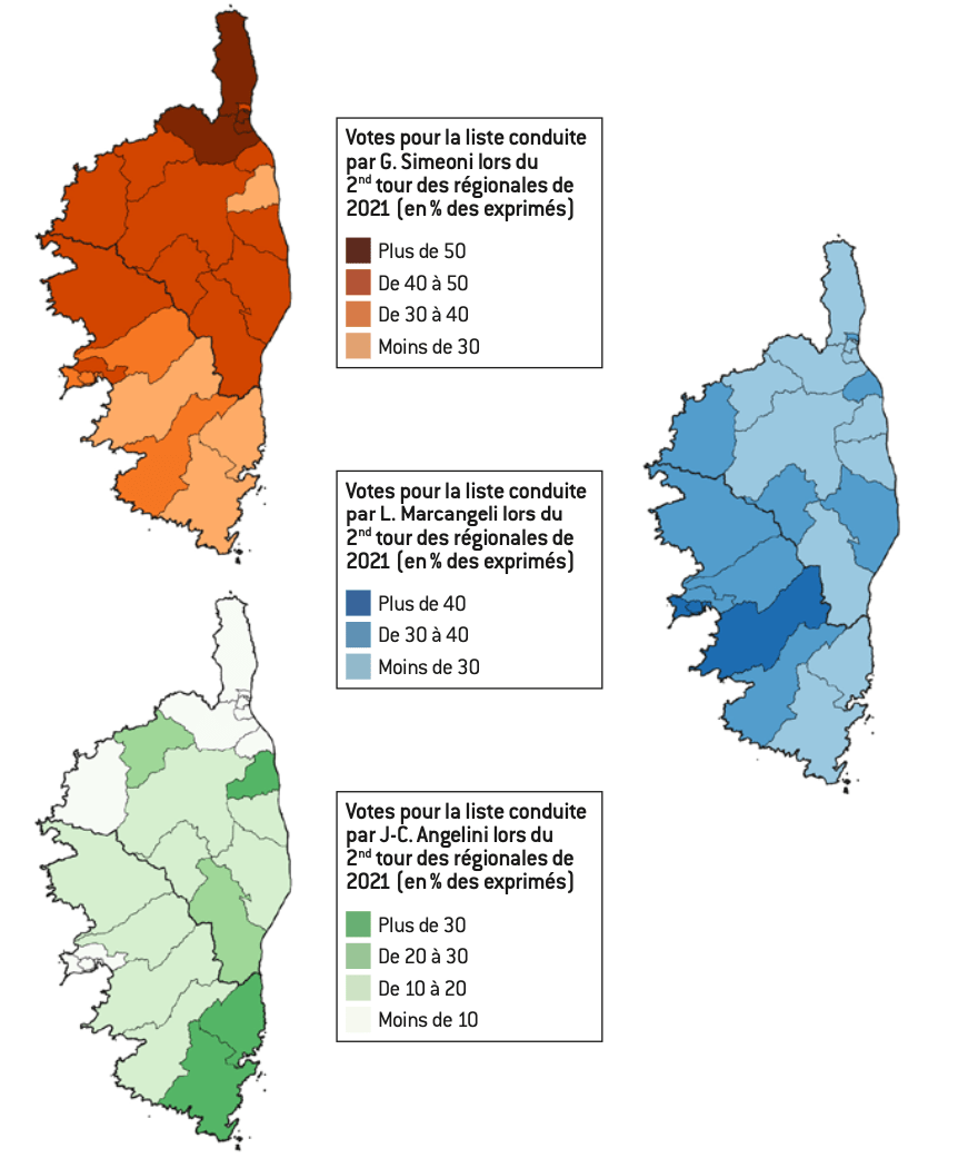 Carte 14 : Corse : votes pour les listes conduites par Gilles Simeoni, Laurent Marcangeli et Jean-Christophe Angelini lors du 2nd tour des élections régionales de 2021 (en % des suffrages exprimés, par cantons)