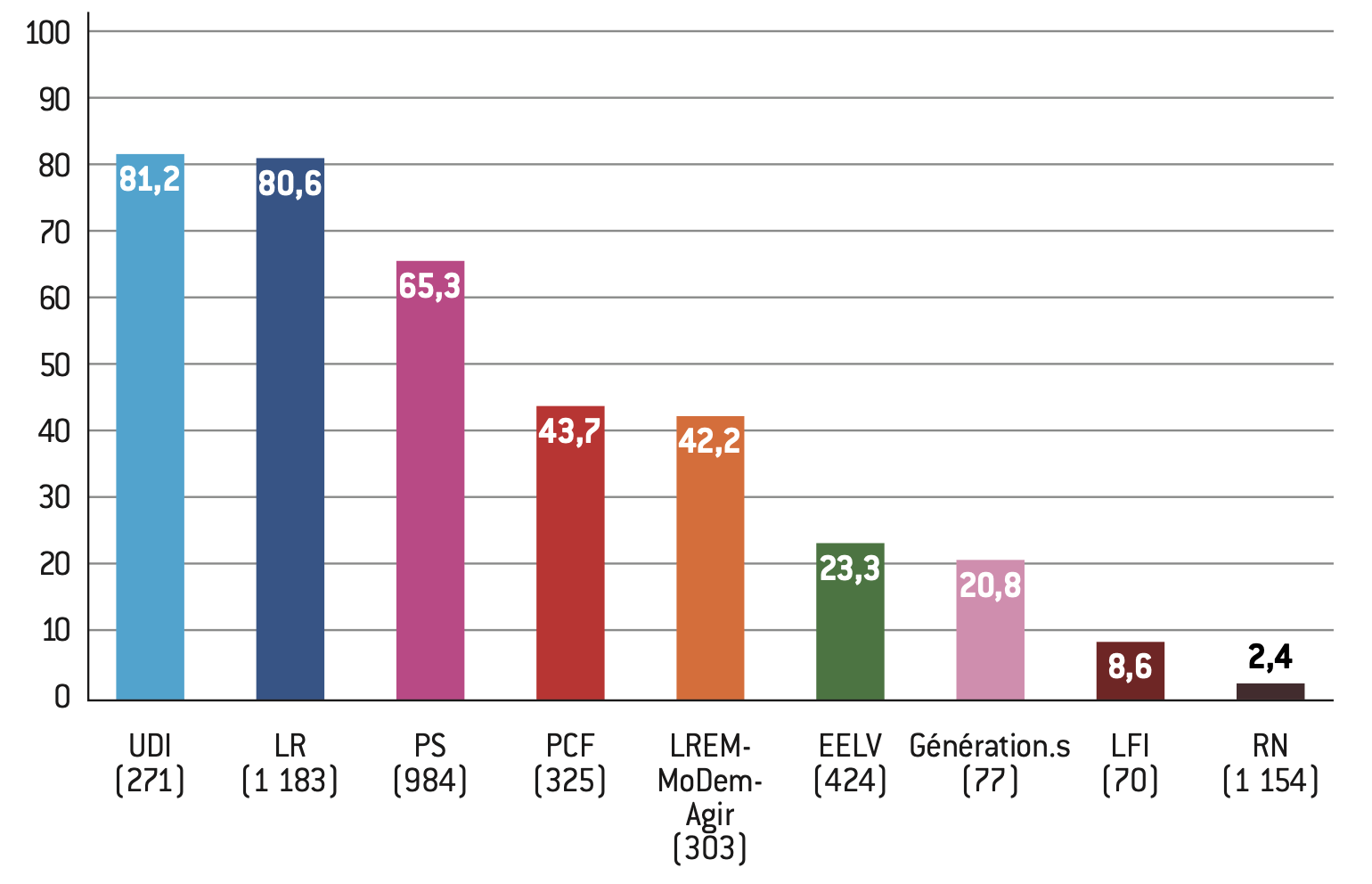 Au-delà de la problématique de second tour rencontrée par le RN, dans l’impossibilité de faire des alliances et victimes d’un front républicain qui ne se dément pas, ces taux de victoire témoignent de l’implantation locale de ces différents partis. Sur les 1.183 candidats se présentant avec l’étiquette LR, 703 étaient sortants, auxquels on peut ajouter 142 maires85. À l’UDI, sur 271 candidats, 198 étaient sortants et 38 étaient maires. Au PS, ce sont 508 sortants et 122 maires parmi les 984 candidats qui sont venus appuyer le taux de victoire. Au PCF et dans le camp présidentiel, ce sont respectivement 87 sortants et 40 maires et 83 sortants et 49 maires qui s’alignaient. À l’inverse, parmi les taux de victoire les plus faibles, on ne trouve que 11 sortants et 6 maires pour EELV et 26 sortants et 13 maires pour le RN.