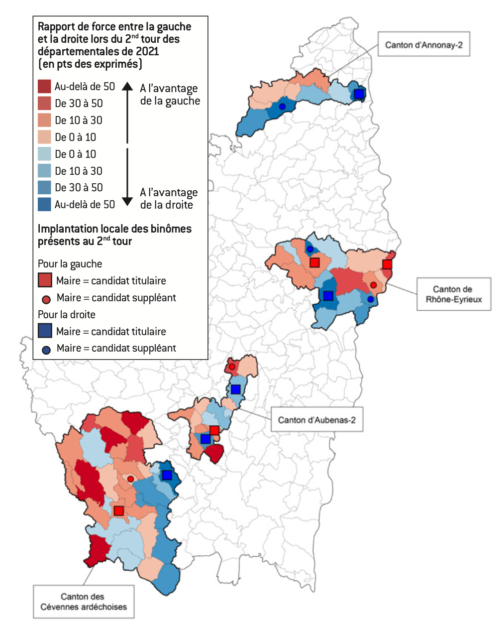 Carte 16 : Ardèche : rapport de force entre la gauche et la droite lors du second tour des élections départementales de 2021 dans les cantons d’Annonay-2, Rhône-Eyrieux, Aubenas-2 et des Cévennes ardéchoises