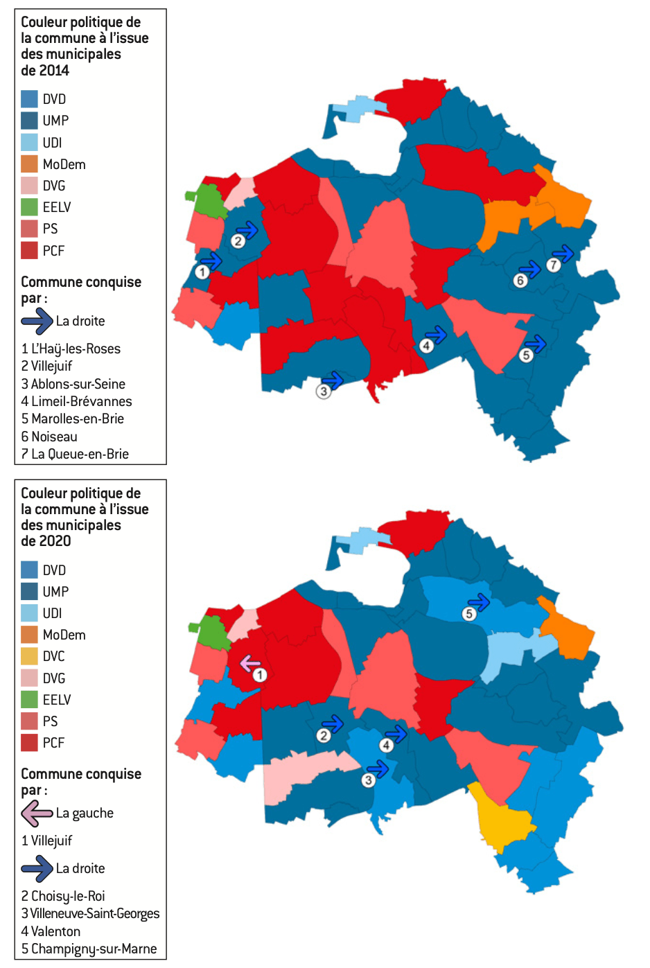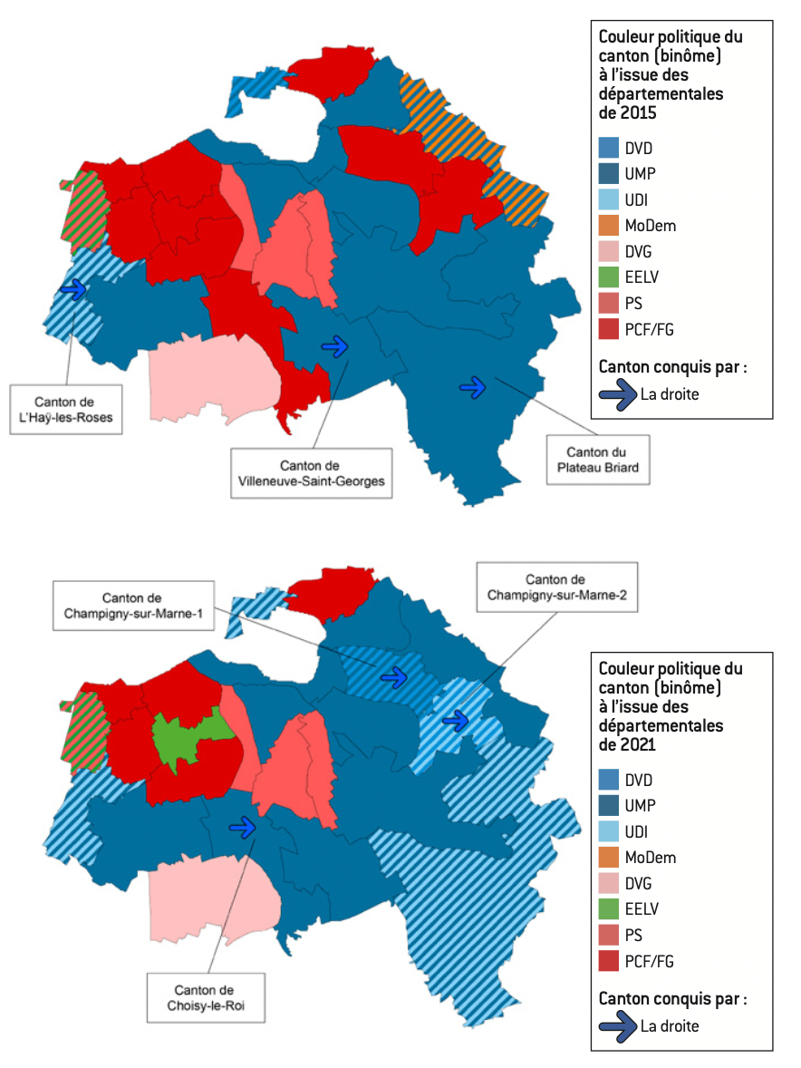 Carte 17 : Val-de-Marne : évolution de la couleur politique des communes et des cantons de 2014 à 2021