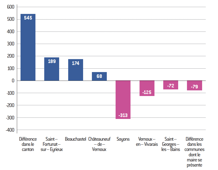 Dans le canton d’Aubenas-2, la situation était plus complexe. D’une part, les deux sortants de gauche se représentaient et, d’autre part, l’un d’eux était également maire d’une commune du secteur, ce qui était aussi le cas d’un remplaçant du binôme. À droite, les deux candidats titulaires sont maires. C’est grâce à l’avance cumulée dans leurs communes respectives que les maires de droite parviennent à renverser les sortants (voir graphique 31). La différence en voix entre le binôme de droite et le binôme de gauche dans les quatre communes concernées est supérieure (avec 233 voix) à l’écart final entre les deux binômes (148 voix d’avance pour la droite). Ainsi, les électeurs des deux communes dont les maires étaient candidats pour la droite ont fait la différence dans ce canton où les conseillers sortants avaient su bénéficier de leur statut pour virer en tête sur le reste du canton.