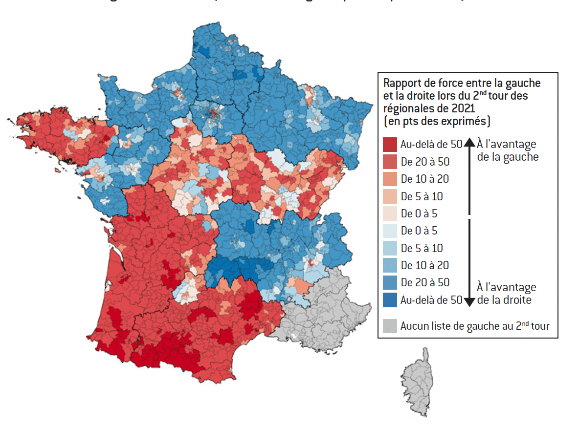 Carte 10 : Rapport de force entre la gauche et la droite lors du second tour des élections régionales de 2021 (en % des suffrages exprimés, par cantons)
