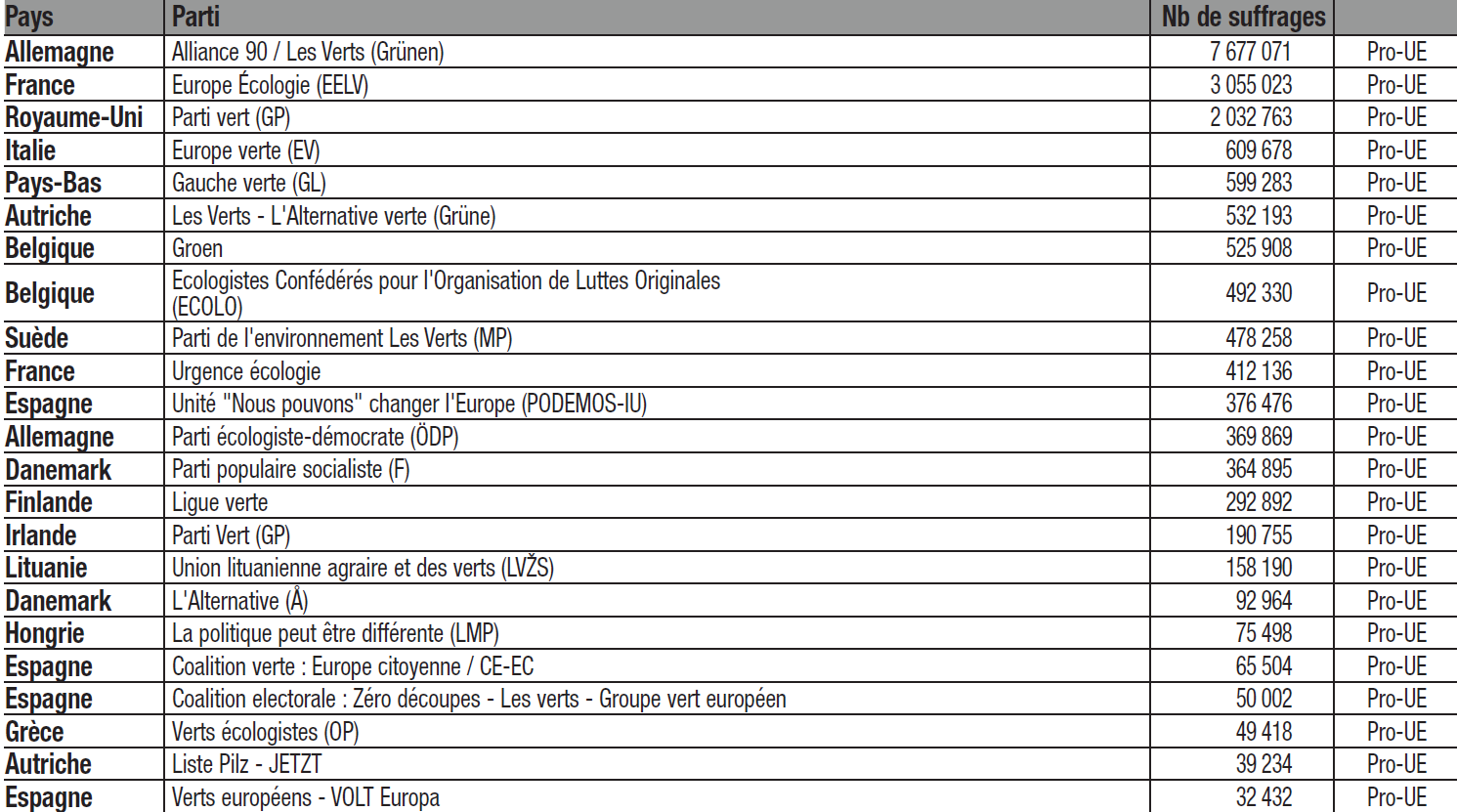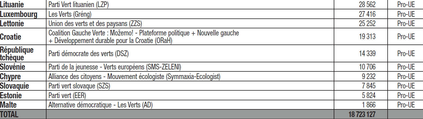 Cet électorat regroupe les votes en faveur des listes écologistes stricto sensu. Le poids de cet électorat (9,4%) ne correspond pas exactement au poids électoral du groupe Verts/ALE au Parlement européen (9,9% des sièges et 10,2% des suffrages exprimés), dans la mesure où ce dernier inclus certains élus des listes animalistes et «pirates», classées ici dans un électorat que nous désignons atypiques/émergents.