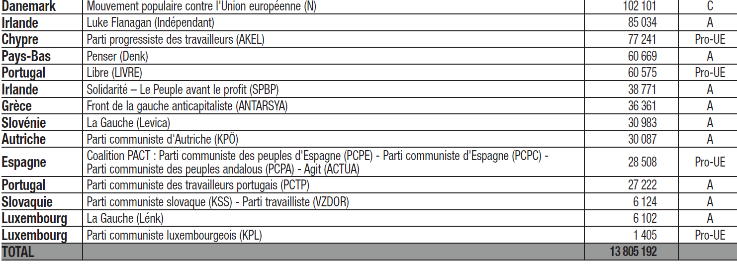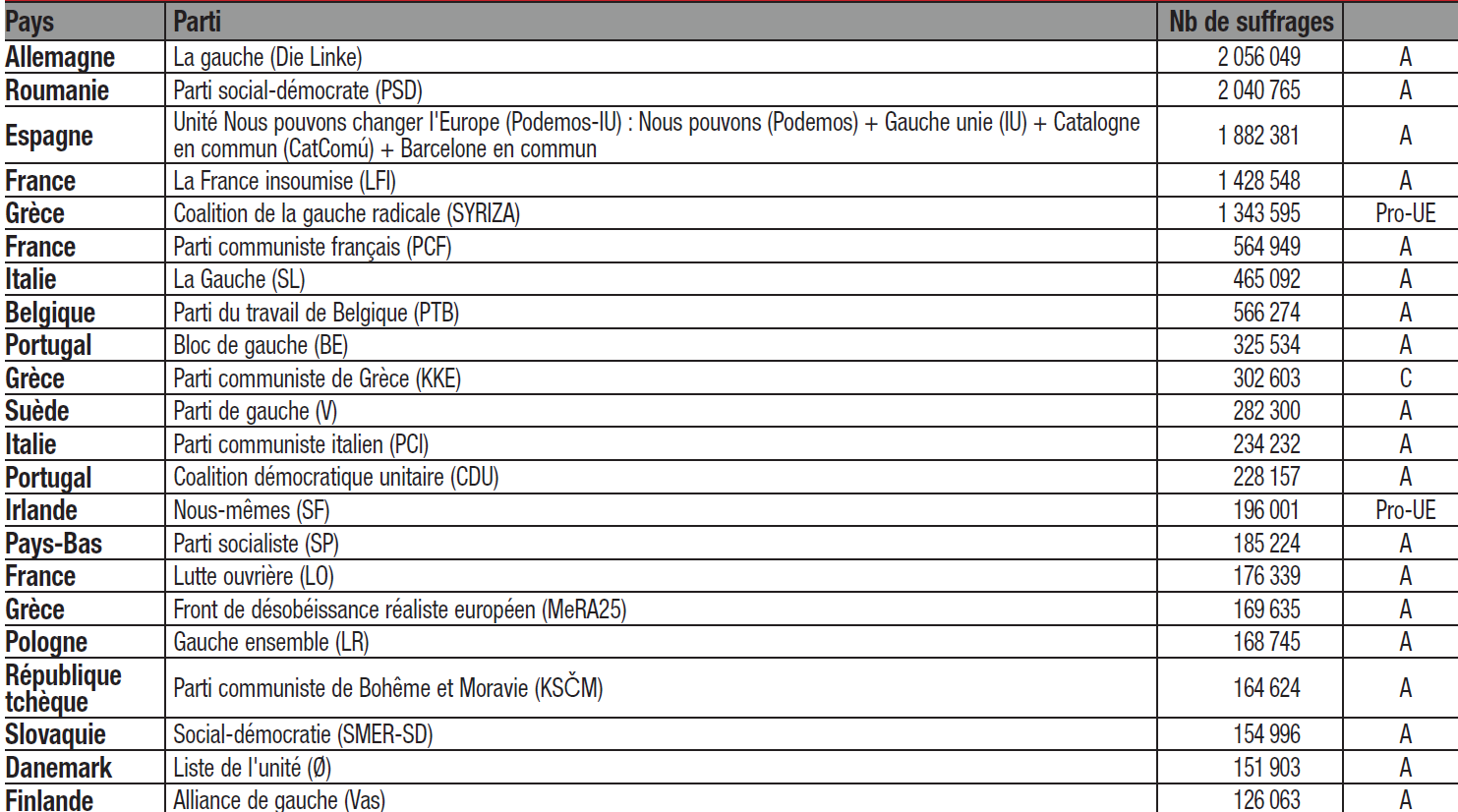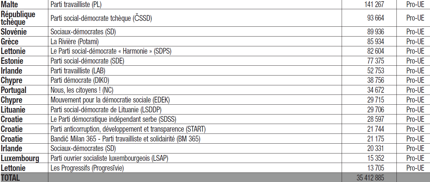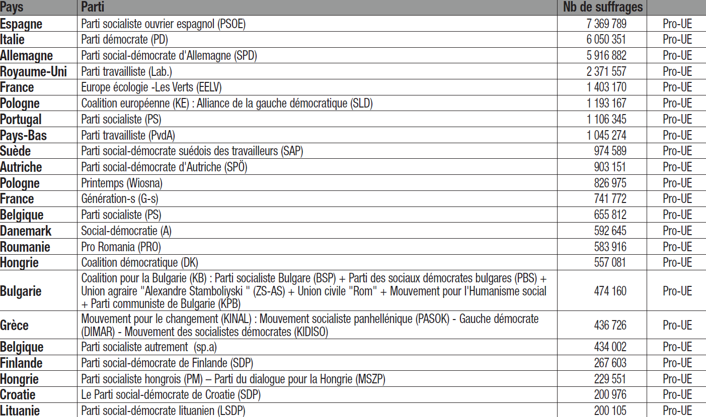 L’électorat de la gauche proeuropéenne regroupe les votes pour des listes de type social-démocrate, favorables à l’approfondissement de l’intégration européenne. Les électeurs de certains partis nationaux membre de l’Alliance progressiste des socialistes et démocrates (S&D) au Parlement européen, tels ceux du SMER slovaque, ont été agrégés à un électorat que nous nommons «gauche populiste». Les électeurs du parti slovaque se trouvent ainsi classés dans la catégorie «électorat de la gauche populiste et de l’extrême gauche».