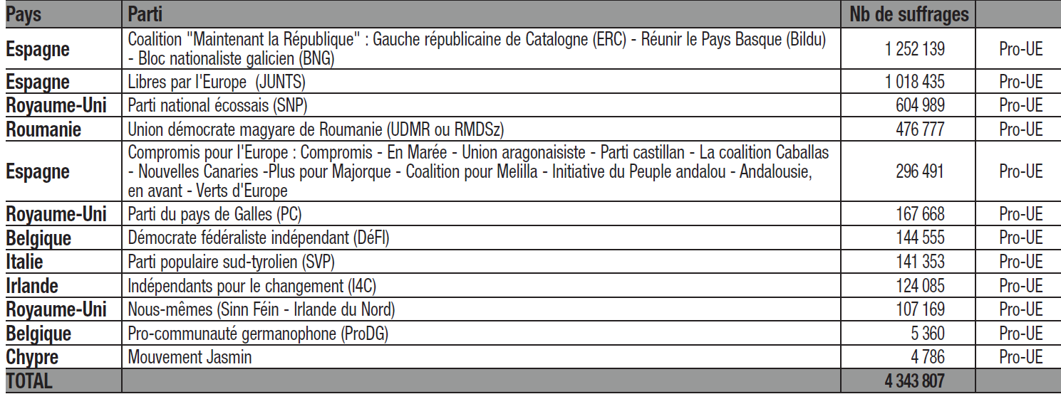 Avec plus de 4 millions de suffrages, l’électorat des régionalistes/indépendantistes est principalement concentré en Espagne (Libres par l’Europe, avec 1.018.435 suffrages pour l’indépendance de la Catalogne, et Ahorá Republicas, rassemblant 834.749 suffrages indépendantistes dans plusieurs régions d’Espagne), en Écosse (Parti national écossais avec plus de 600.000 suffrages) et en Roumanie (Union démocrate magyare de Roumanie, 476.777 voix).