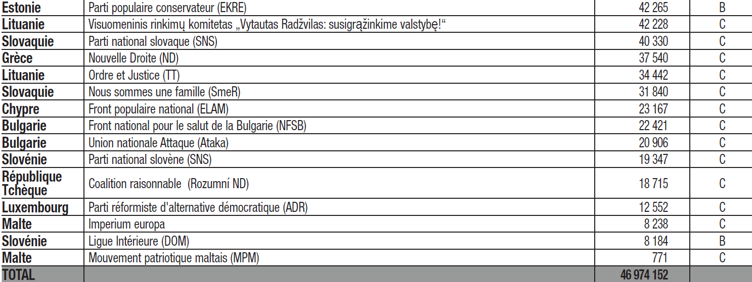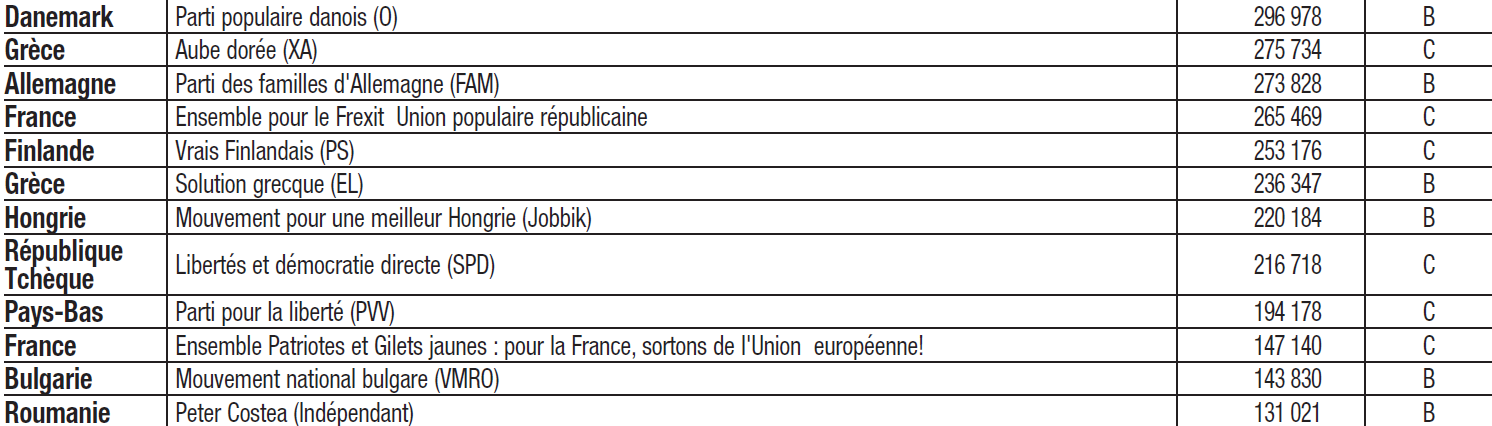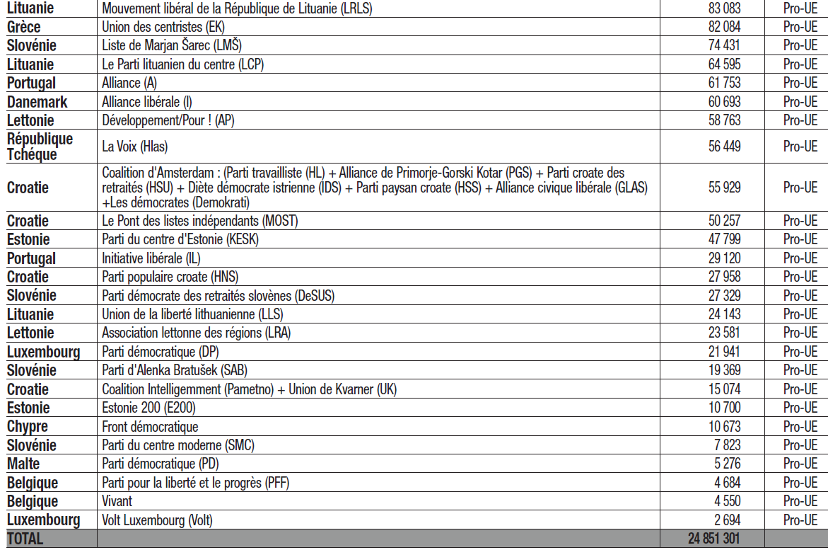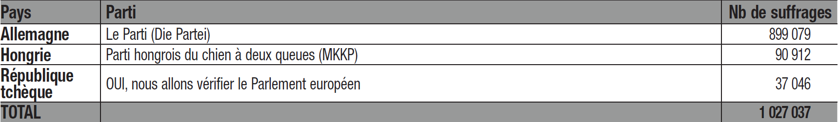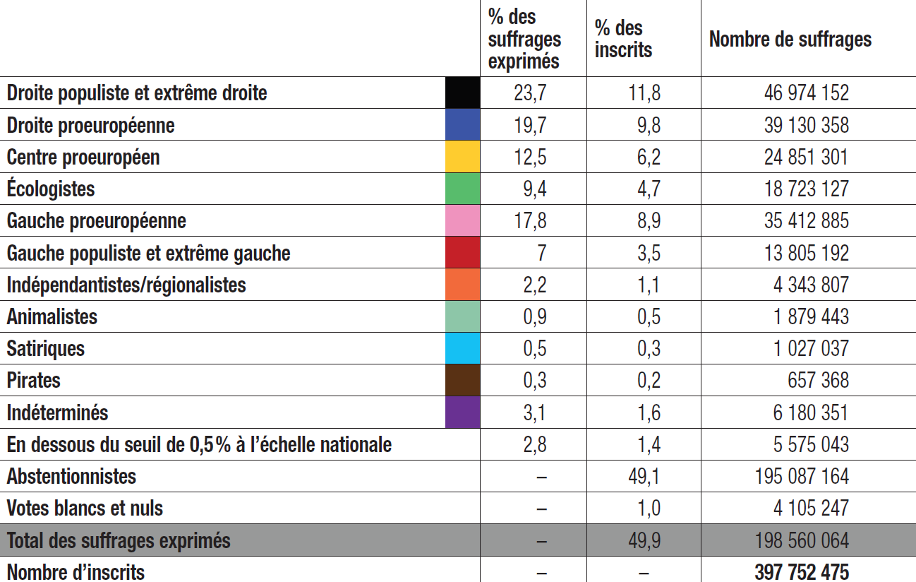 Notons que l’abstention reste très élevée puisqu’elle concerne 195 millions d’Européens. Nous observons également que les votes blancs et nuls représentent plus de 4 millions de votes, soit plus que les votes animalistes, pirates et satiriques réunis.