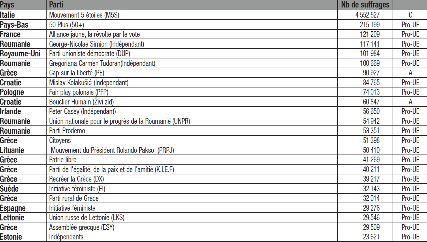 Les électorats atypiques/émergents, composés des animalistes, des «pirates» et des listes satiriques, qui représentent 3.563.848 suffrages, n’ont aucun poids au Parlement européen. La multitude de petits partis nationaux non représentés rend donc invisible un nombre de suffrages pourtant non négligeable.