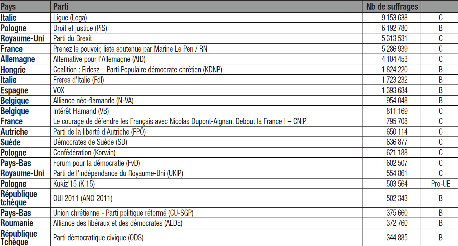 L’électorat «droite populiste extrême droite» est composé du vote en faveur des partis de droite et d’extrême droite entretenant une relation conflictuelle avec l’Union européenne comme institution, voire avec l’idée d’une Union européenne. Le lecteur retrouvera donc dans cet électorat les votes en faveur de formations membres du Parti populaire européen (PPE), telles que le Fidesz de Viktor Orbán.
