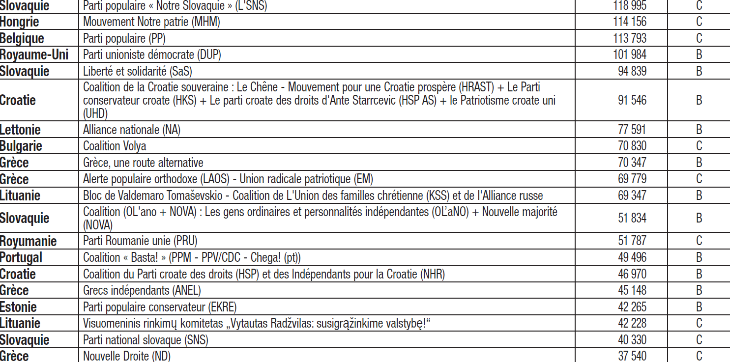 Ont été comptabilisés tous les votes envers des listes/partis/candidats qui ont atteint 0,5% des suffrages exprimés à l’échelle nationale. Avec ce seuil sont recensés et représentés ici 97% des votes exprimés dans toute l’Union européenne.