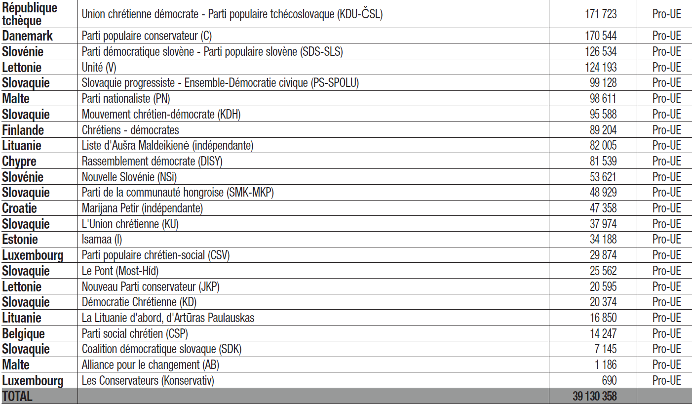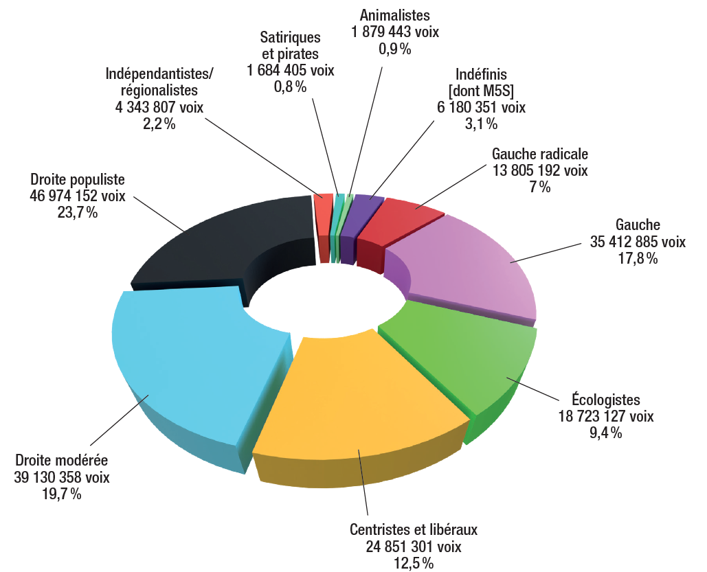 Au sein du vote en faveur des listes proeuropéennes, l’électorat du centre et de la droite réunit 63.981.659 suffrages et représente 32,2% des suffrages exprimés et 16% du total des inscrits, soit près du double de l’électorat de la gauche proeuropéenne : 35.412.885 suffrages, 17,8% des suffrages exprimés et 8,9% du total des inscrits.